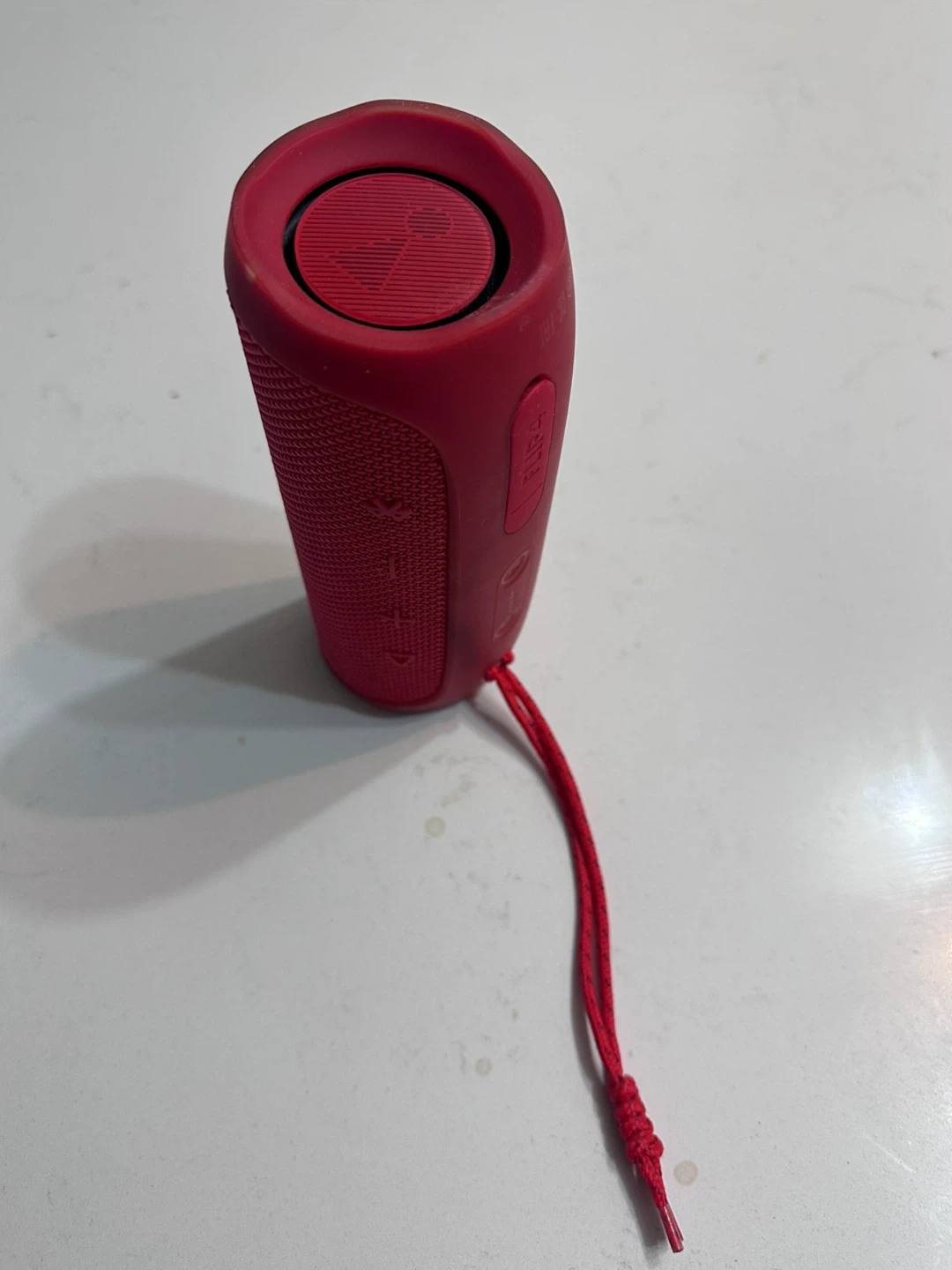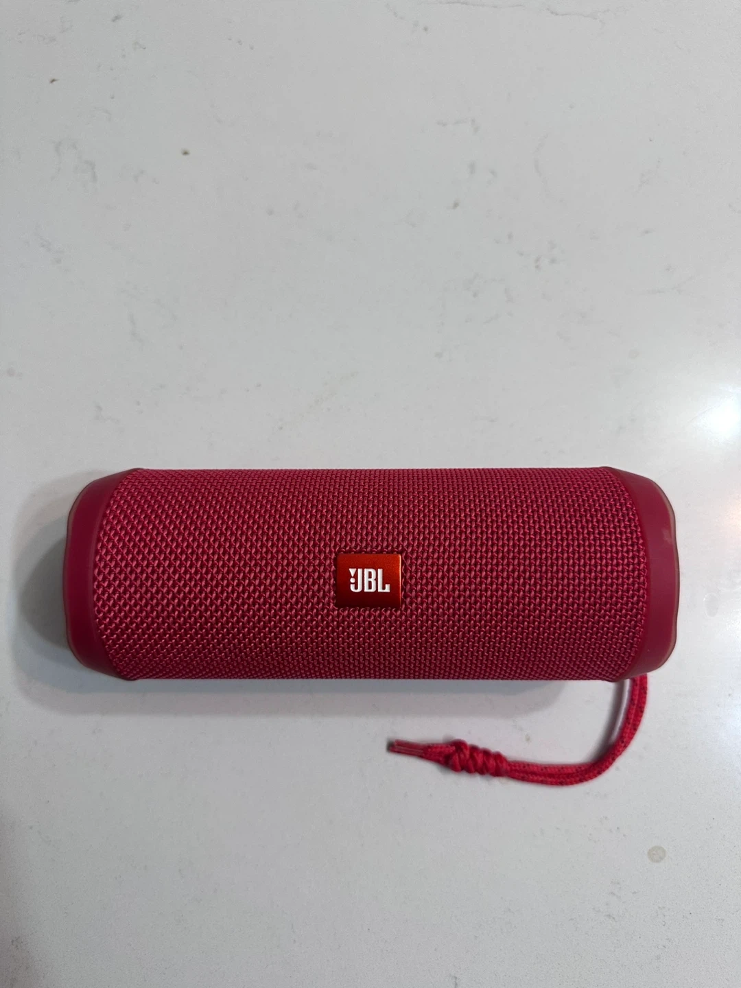 It's a JBL Flip 4 portable Bluetooth speaker in red. This speaker is waterproof and has a durable fabric design. It's great for outdoor use or taking your tunes on the go!
