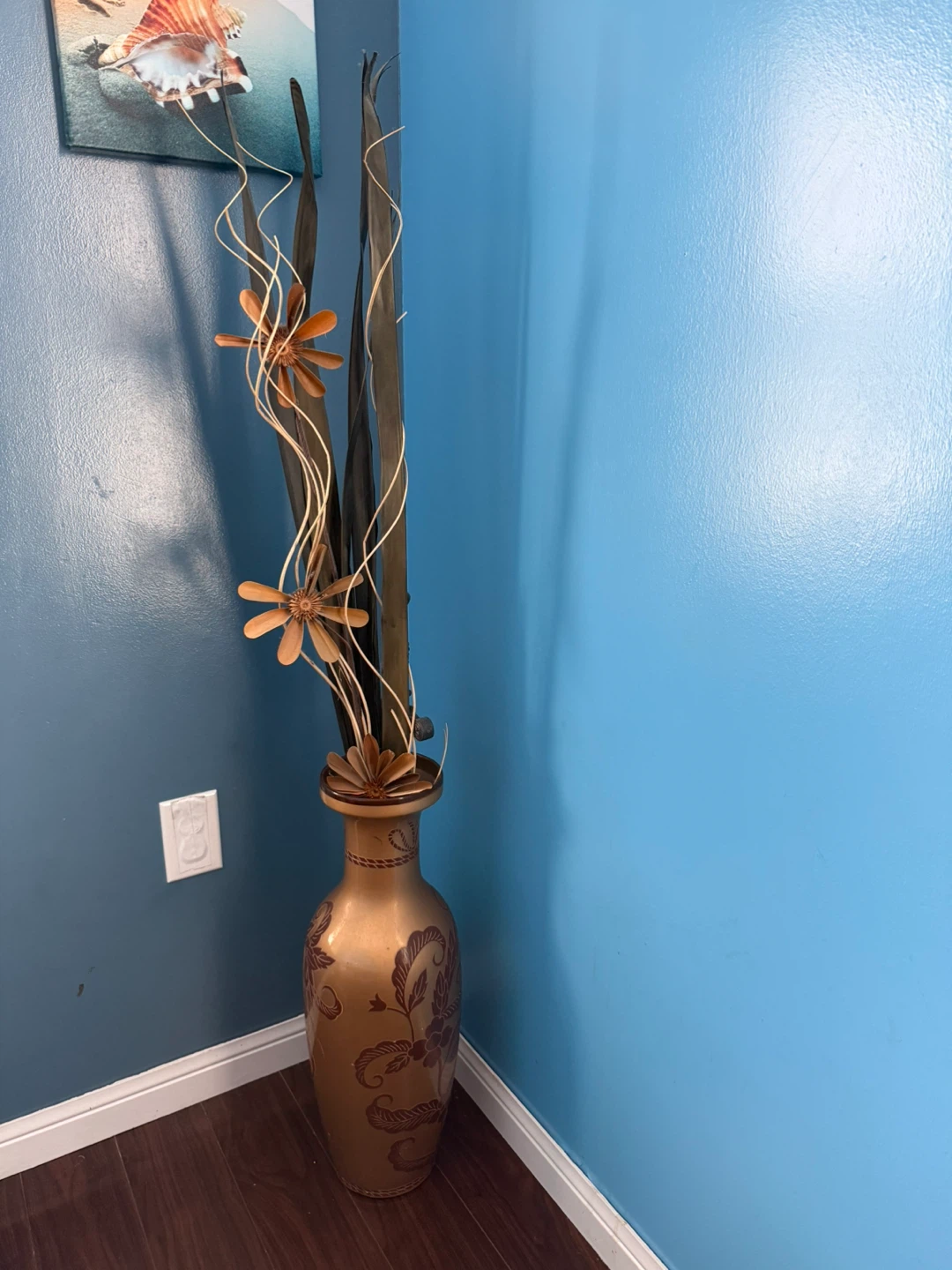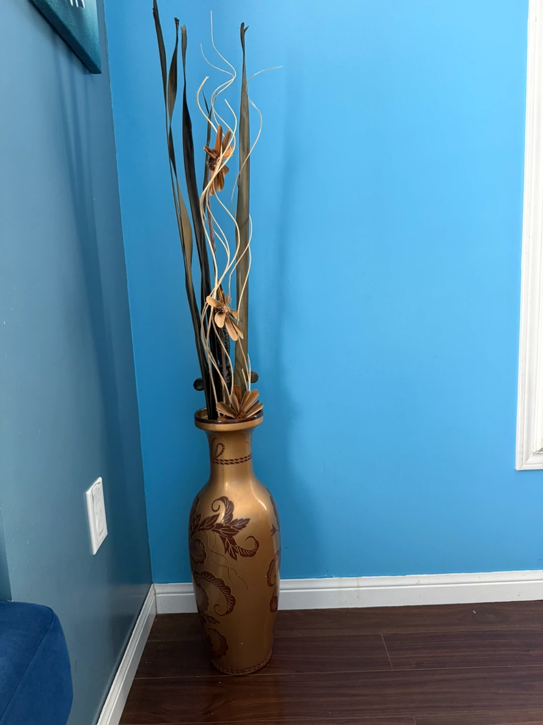 This is a large, decorative vase with a metallic bronze finish and floral etching. It comes with a bundle of dried decorative stems and grasses. It's a statement piece for any room!