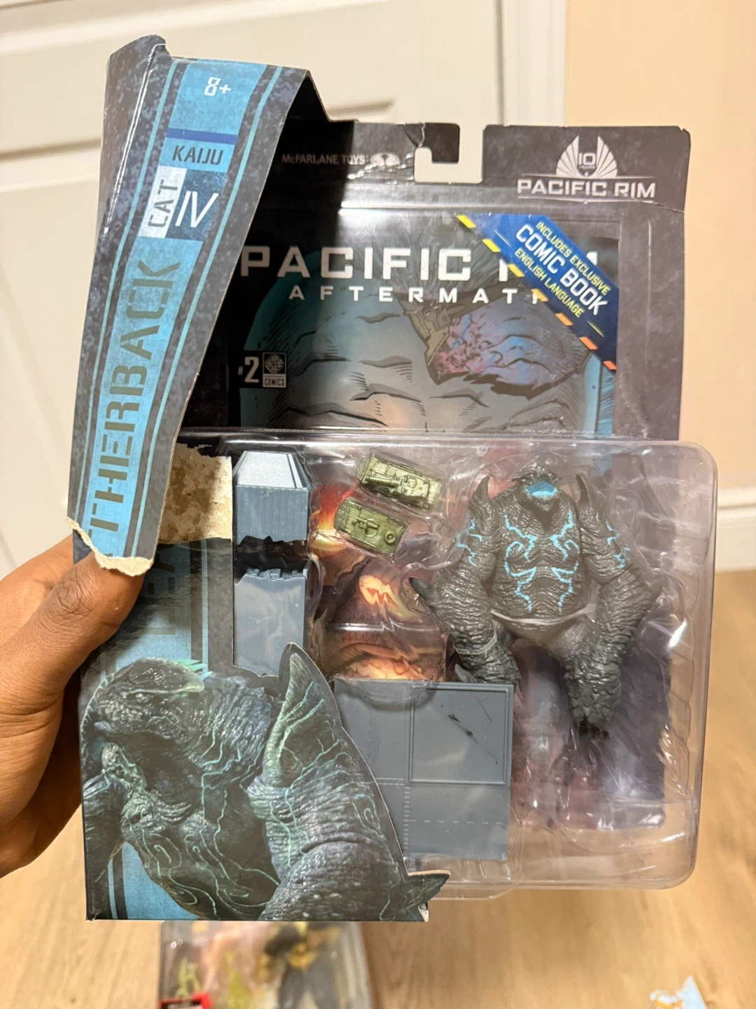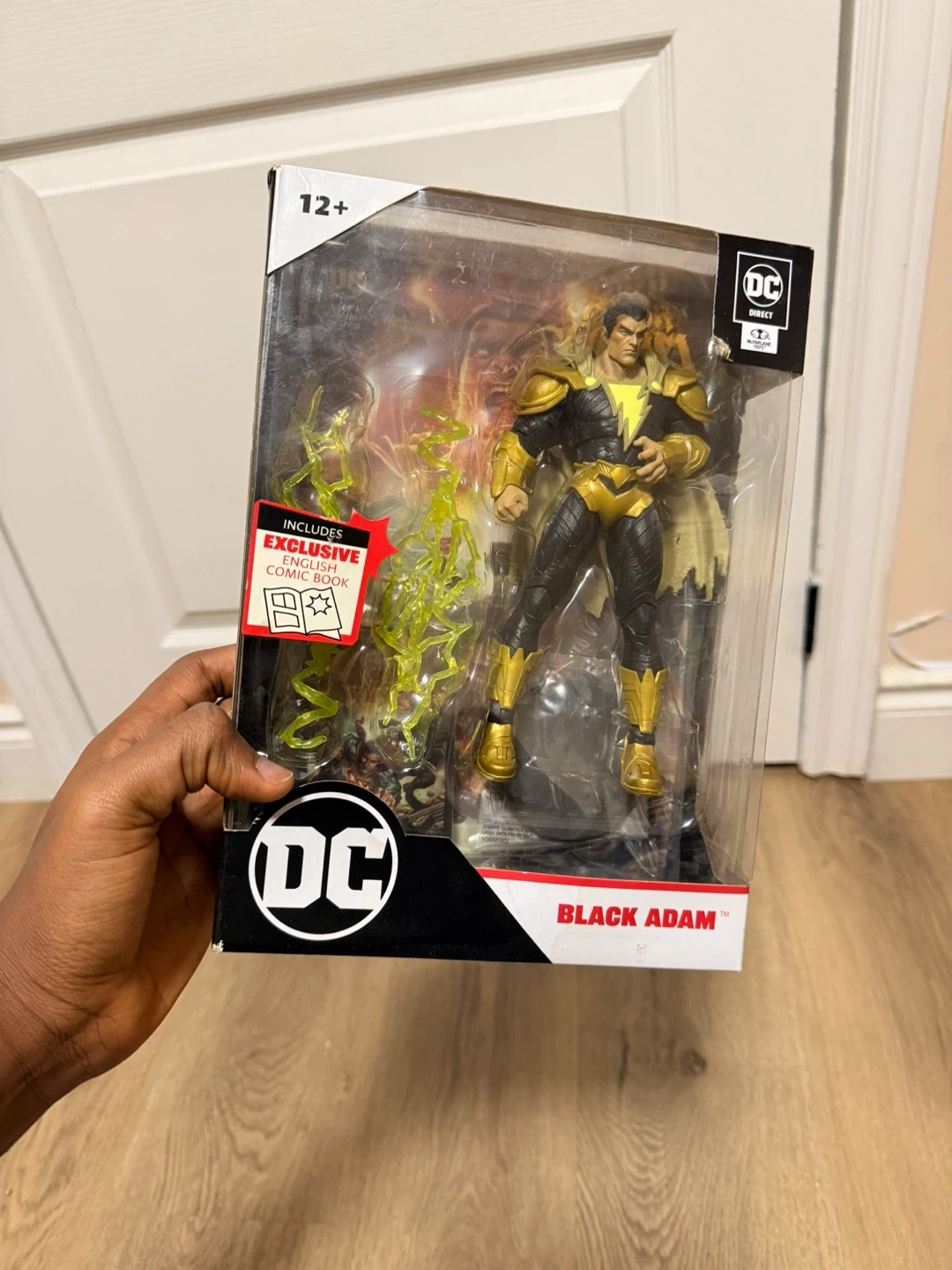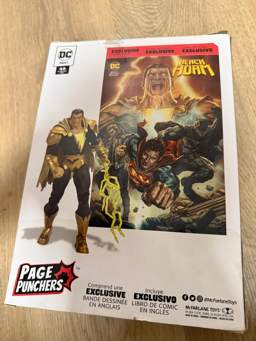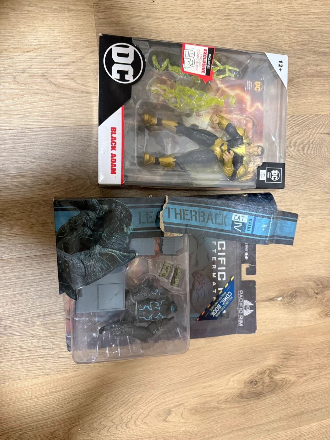 Includes a DC Comics Page Punchers Black Adam action figure with an exclusive comic book. Also includes a Pacific Rim Kaiju IV Leatherback action figure with its own exclusive comic book. Both figures are in their original packaging.