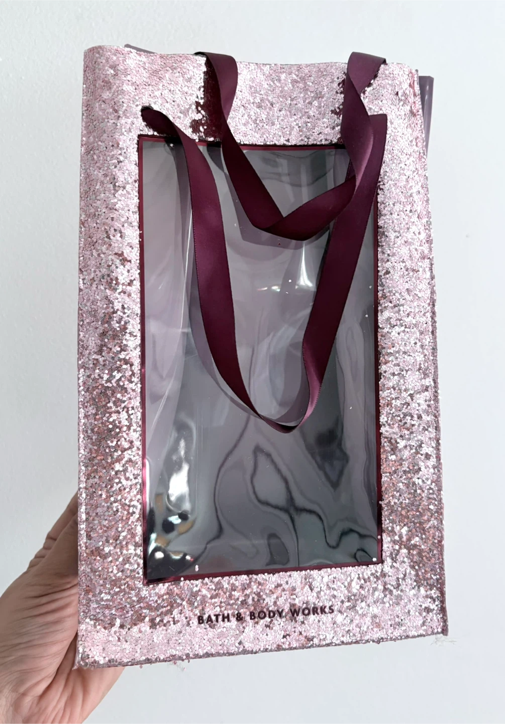 This Bath & Body Works gift bag features a sparkly pink glitter exterior with a clear window.