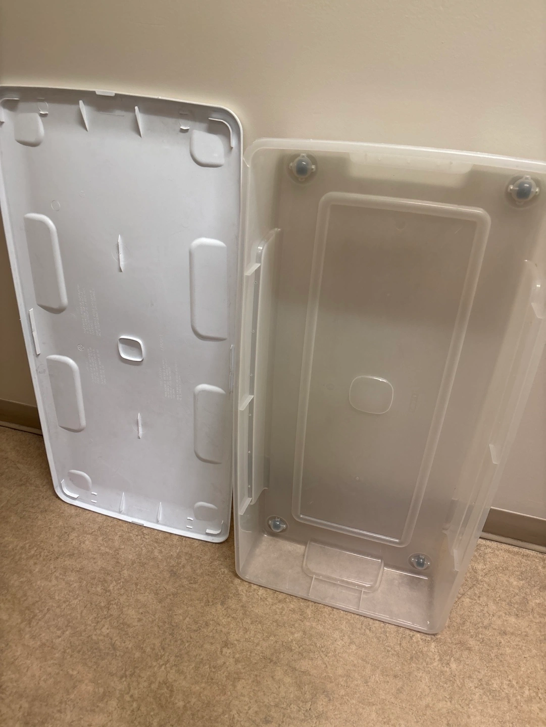 Large clear storage bin with a white lid. Includes a handle on the side. Great for storing toys, clothes, or other household items.