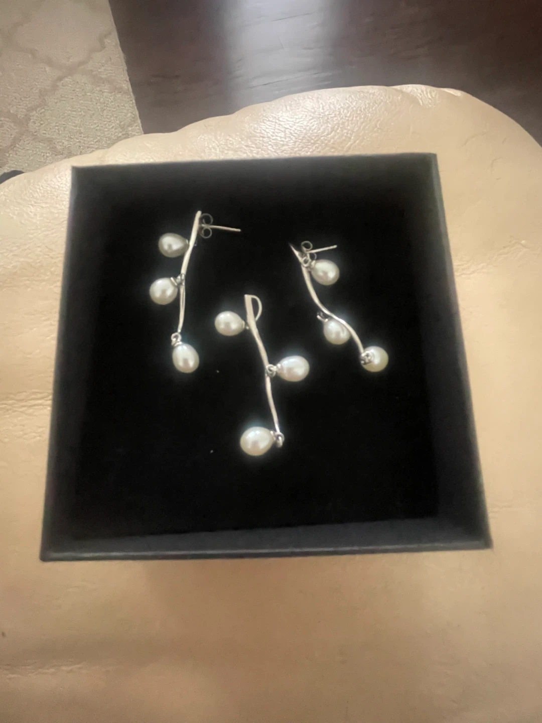 Here's a lovely set of sterling silver pearl earrings and a matching pendant. They come in a box, perfect for gifting or keeping them safe. The set features a delicate design with lustrous pearls on a silver-tone setting. A beautiful addition to any jewelry collection!