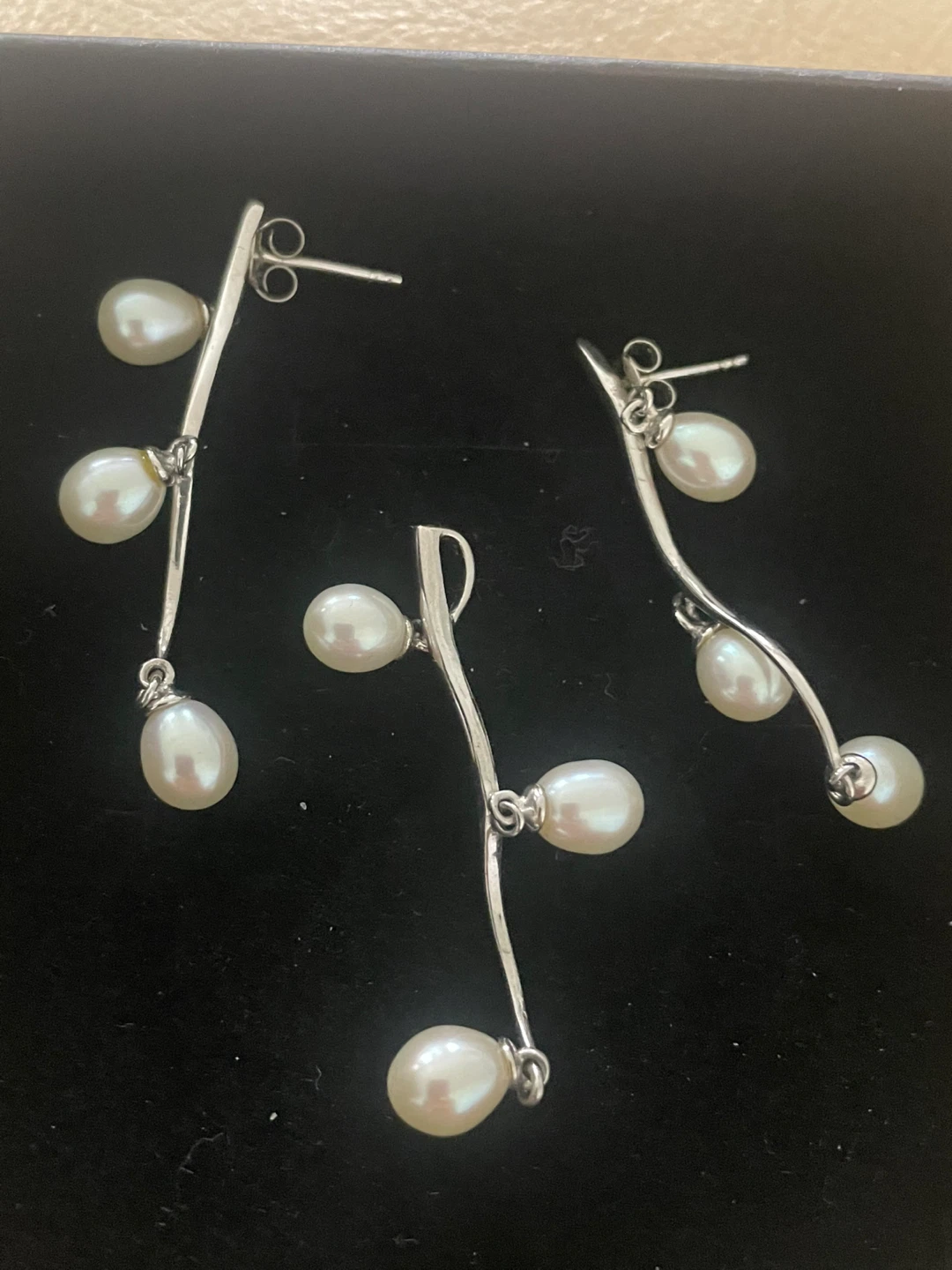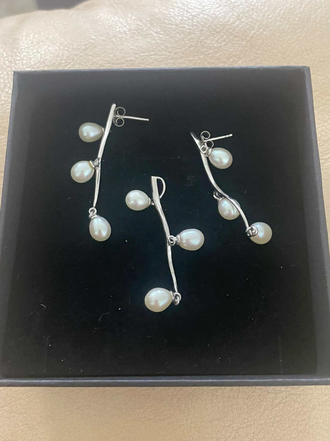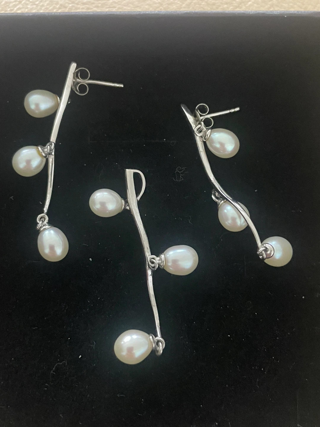 Here's a lovely set of sterling silver pearl earrings and a matching pendant. They come in a box, perfect for gifting or keeping them safe. The set features a delicate design with lustrous pearls on a silver-tone setting. A beautiful addition to any jewelry collection!