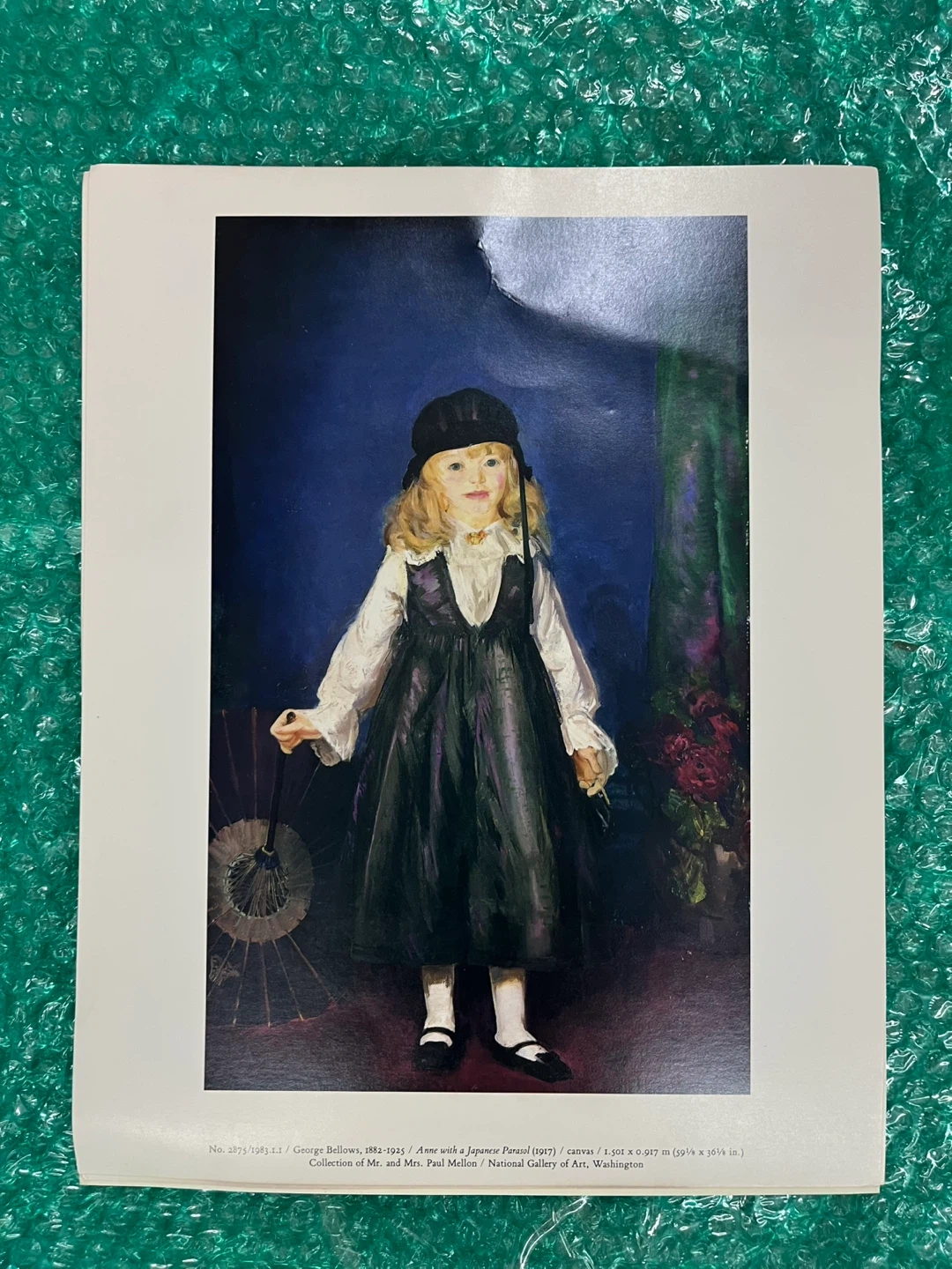 Art print of George Bellows' painting "Anne with a Japanese Parasol" from 1917. It's a canvas print measuring 59 1/8 by 36 1/8 inches. This piece is from the collection of Mr. and Mrs. Paul Mellon at the National Gallery of Art in Washington/printed reproduction.