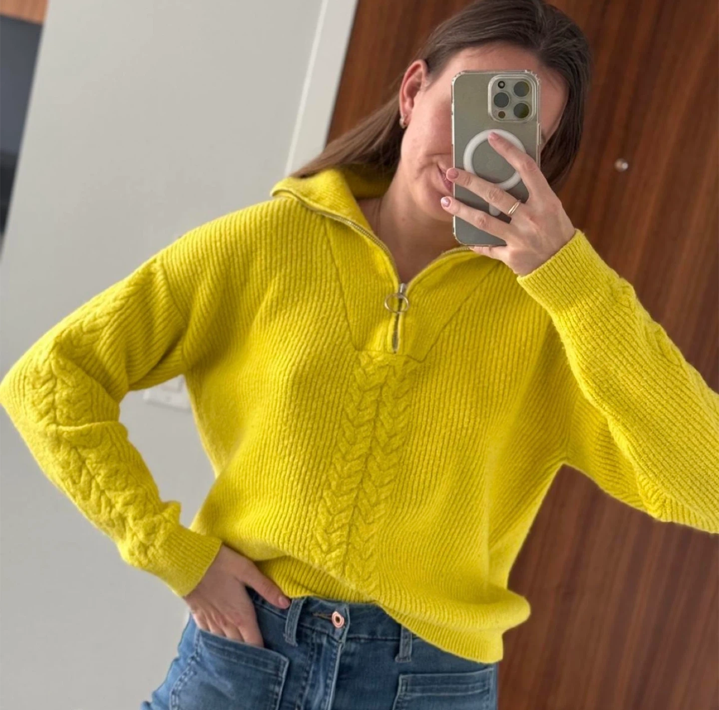 Cozy up in this bright yellow knit pullover! It features a quarter-zip design and a lovely cable knit pattern down the front and on the sleeves. Perfect for adding a pop of colour to your wardrobe and staying warm on chilly days