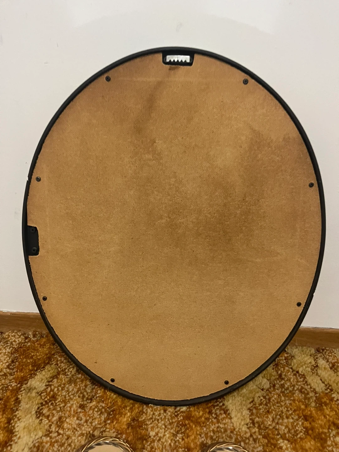 Picture frame vintage classic measures 2’ x 20” This is a decorative oval wall art piece with a gold-tone frame. It's designed to be hung on a wall. The artwork depicts a serene woodland scene with flowers.