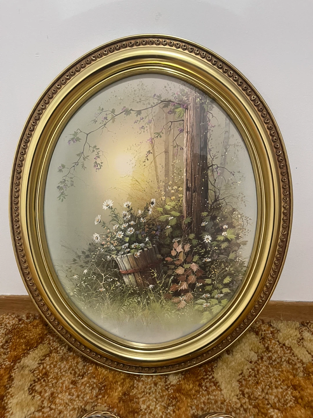 Picture frame vintage classic measures 2’ x 20” This is a decorative oval wall art piece with a gold-tone frame. It's designed to be hung on a wall. The artwork depicts a serene woodland scene with flowers.