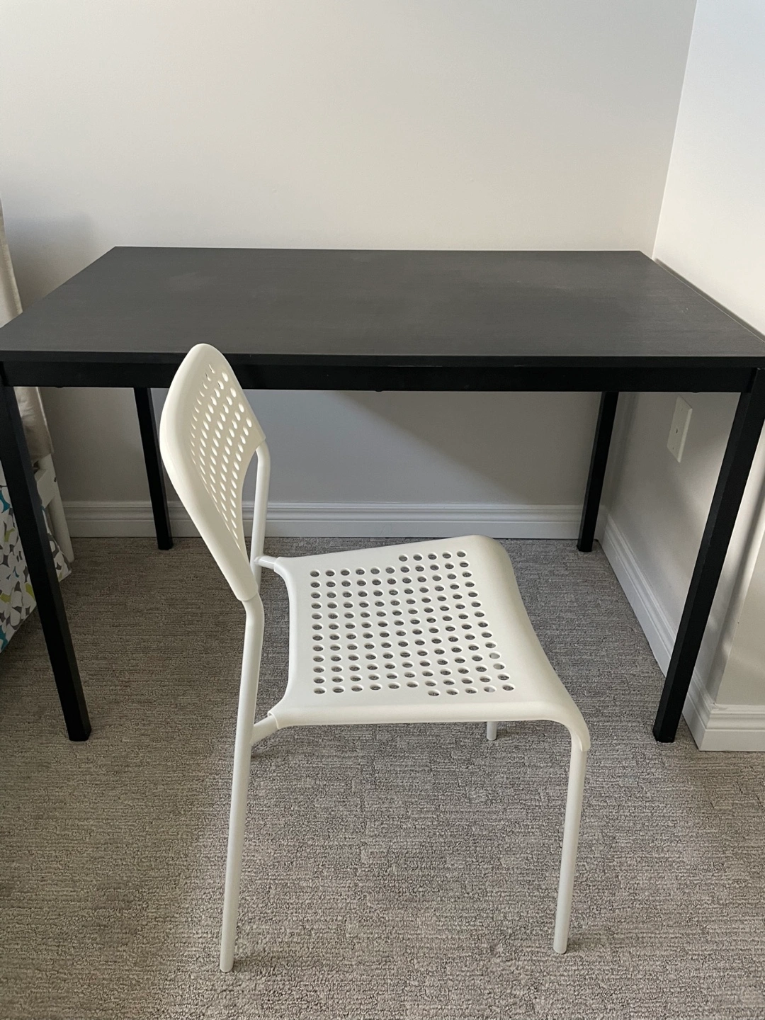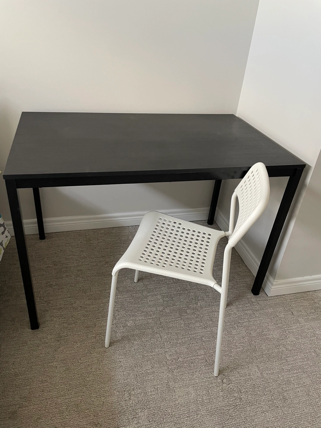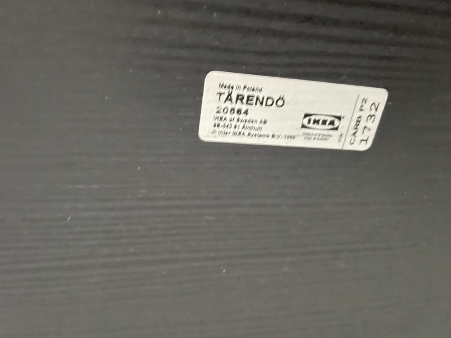 This is an IKEA TÄRENDÖ dining table. It's black with metal legs. It's a great size for a smaller dining area or as a desk. The table comes assembled.