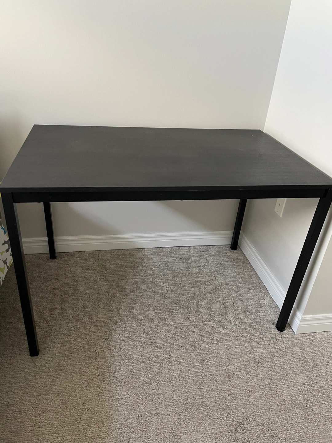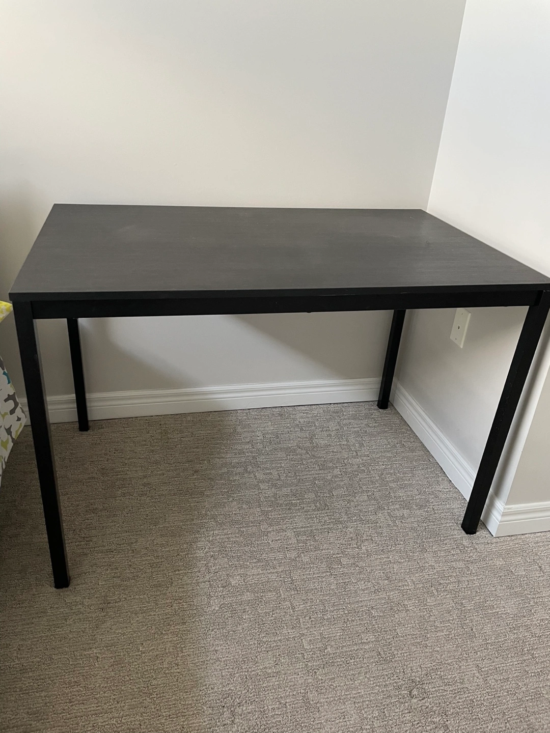 This is an IKEA TÄRENDÖ dining table. It's black with metal legs. It's a great size for a smaller dining area or as a desk. The table comes assembled.