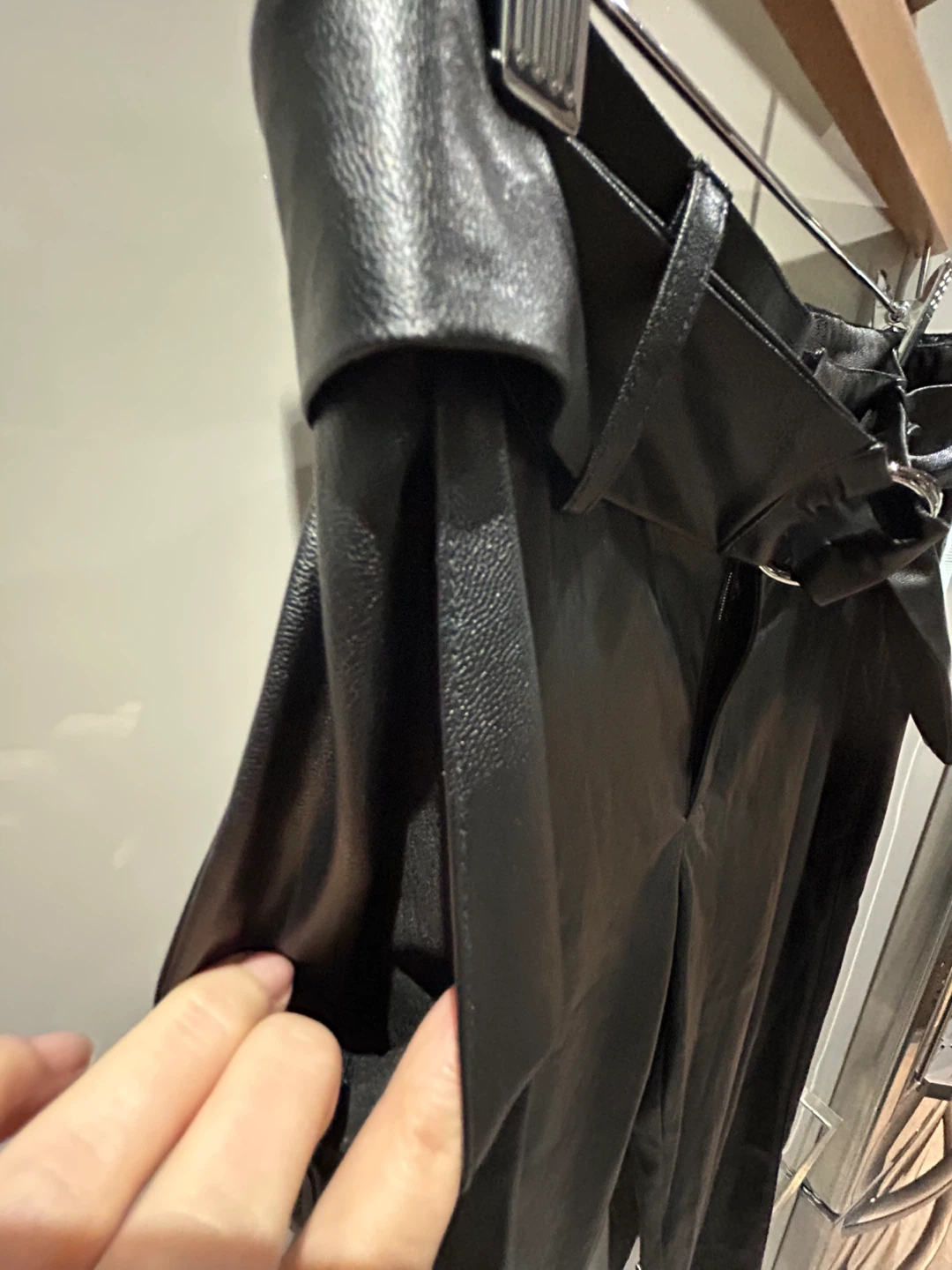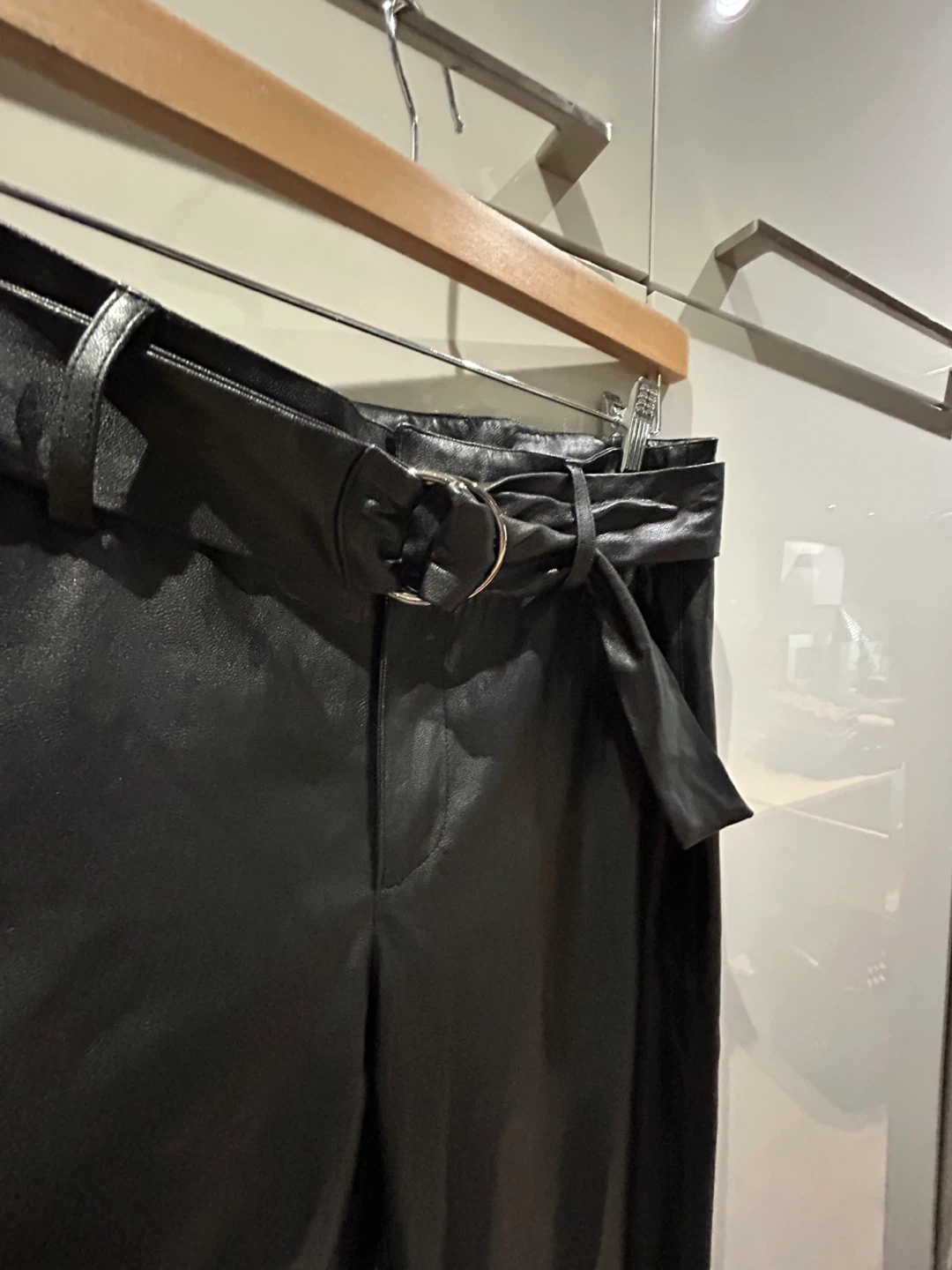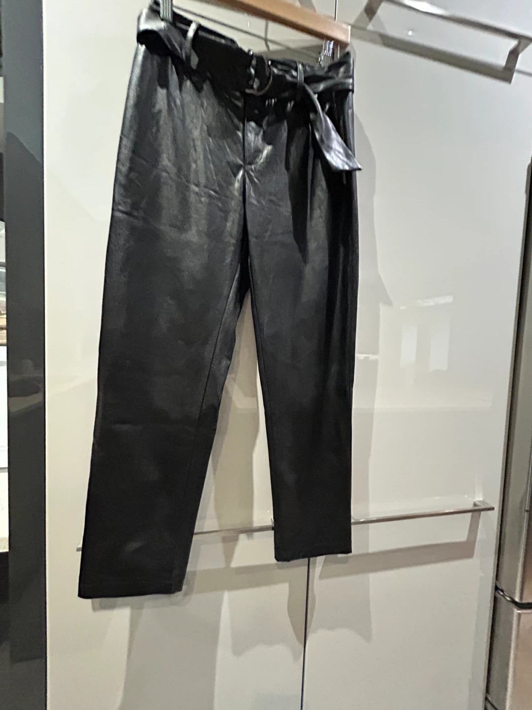 These black faux leather pants feature a belted waist and a relaxed fit. They're made from 100% polyester. Warm lining