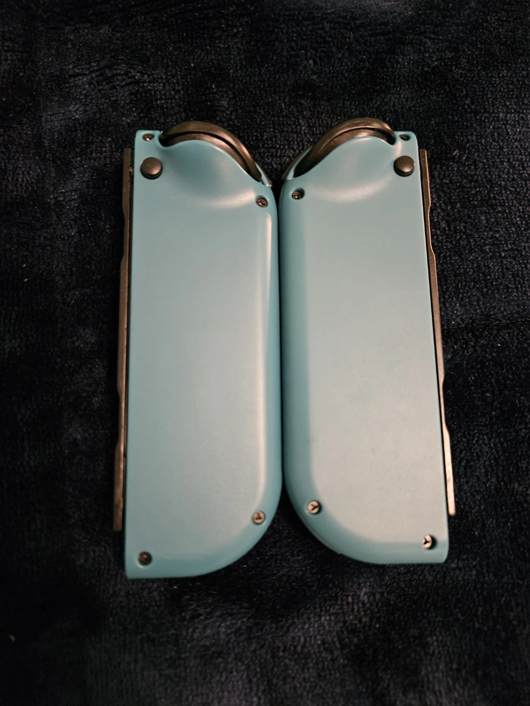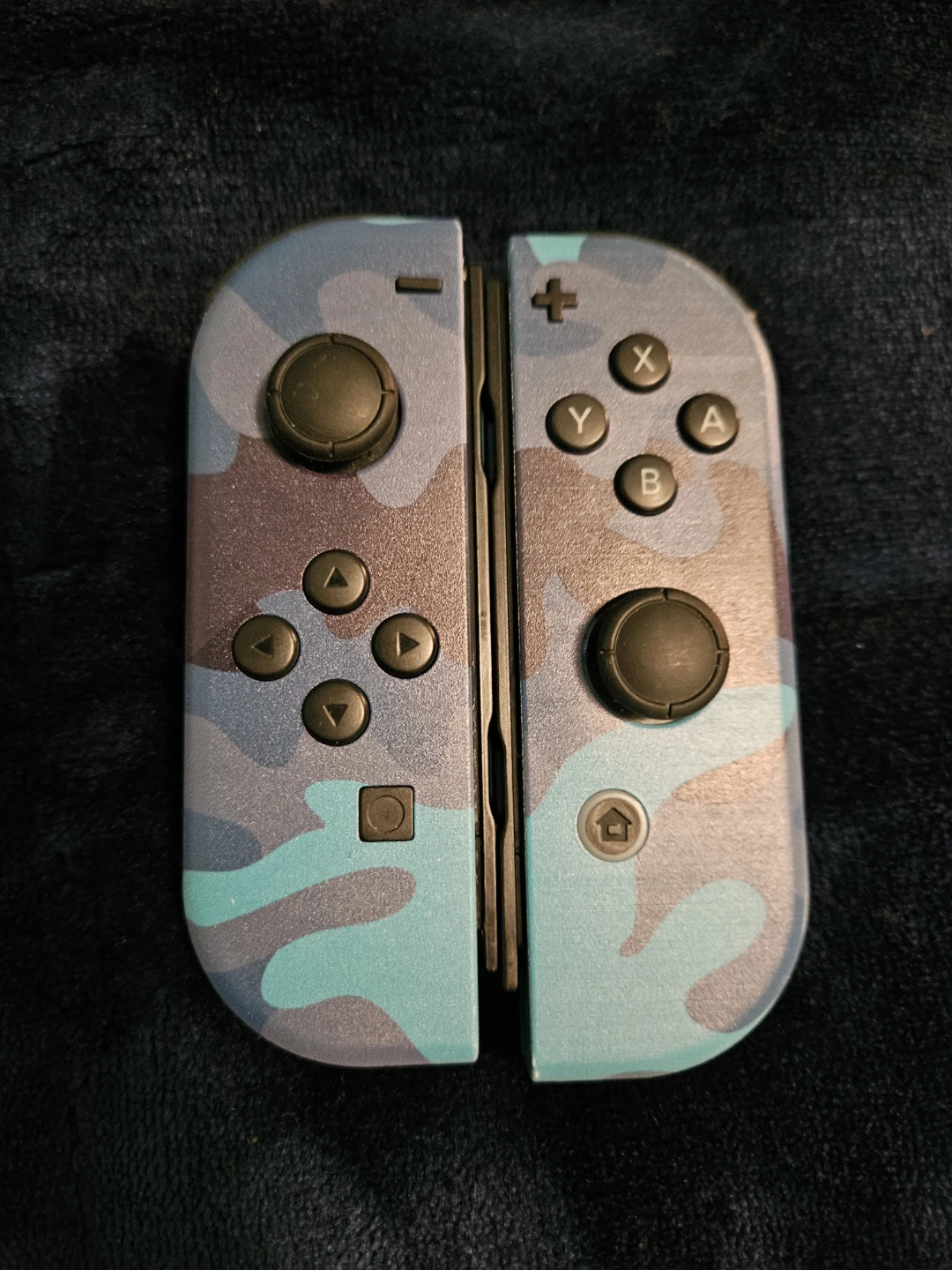 Pair of Nintendo Switch Joy-Con controllers with a blue and light blue camouflage pattern.