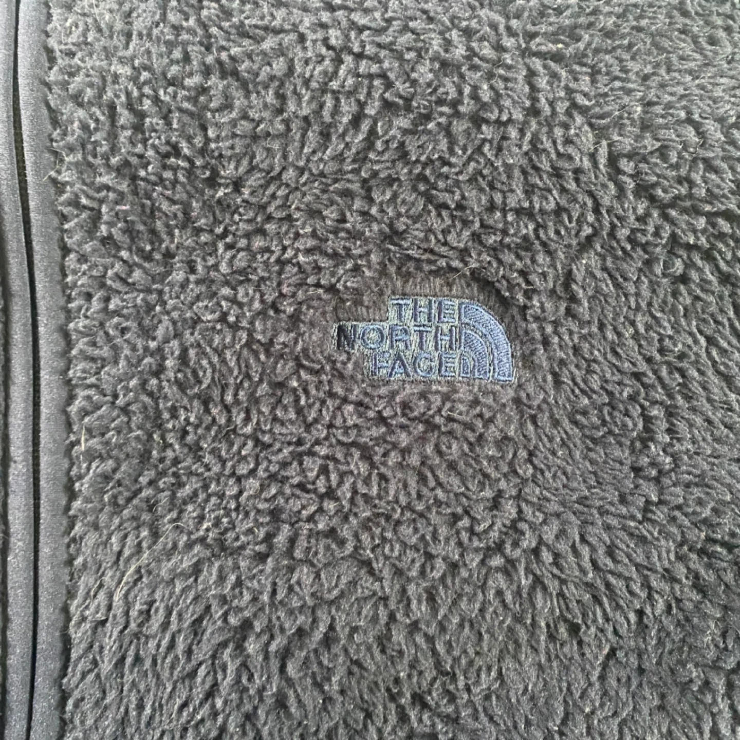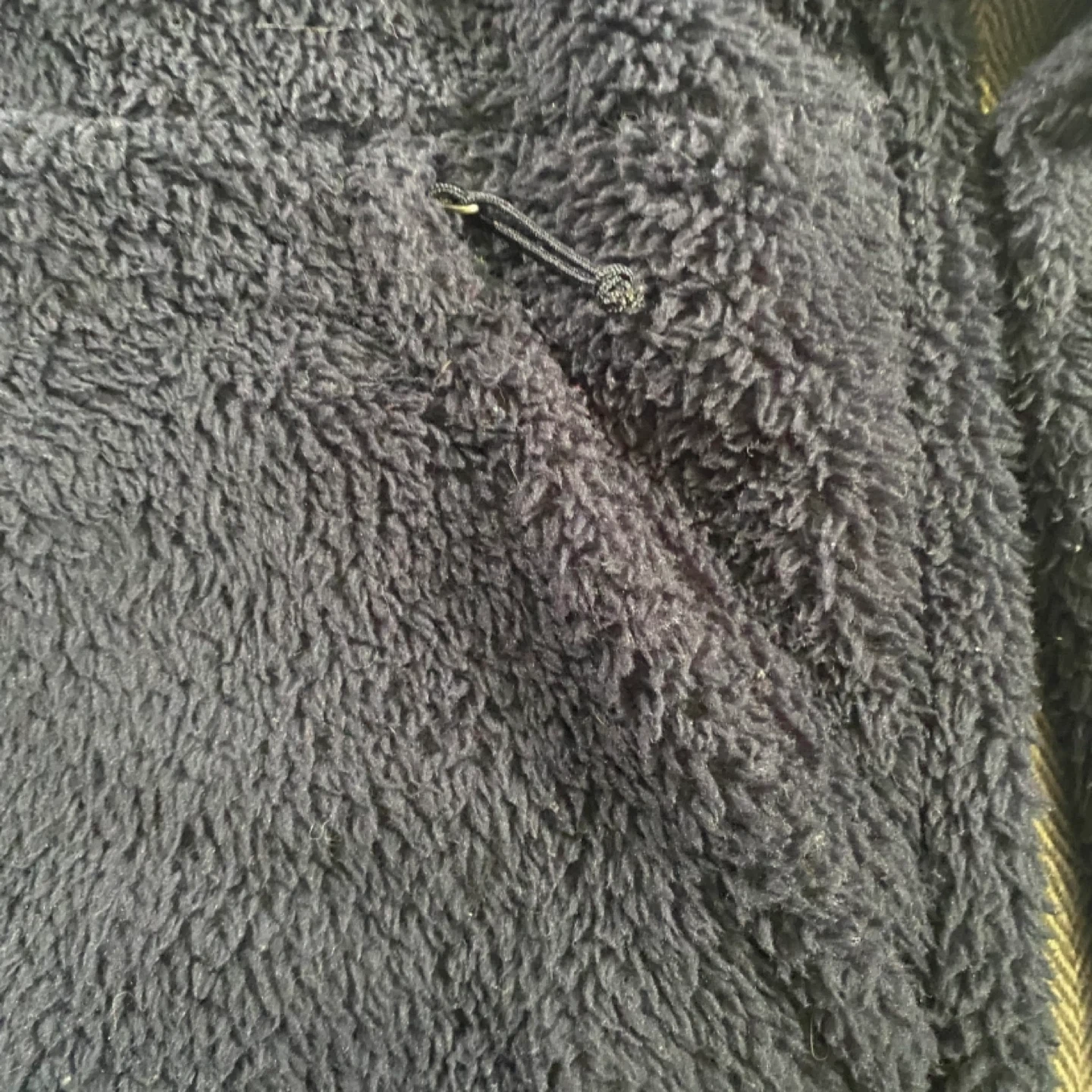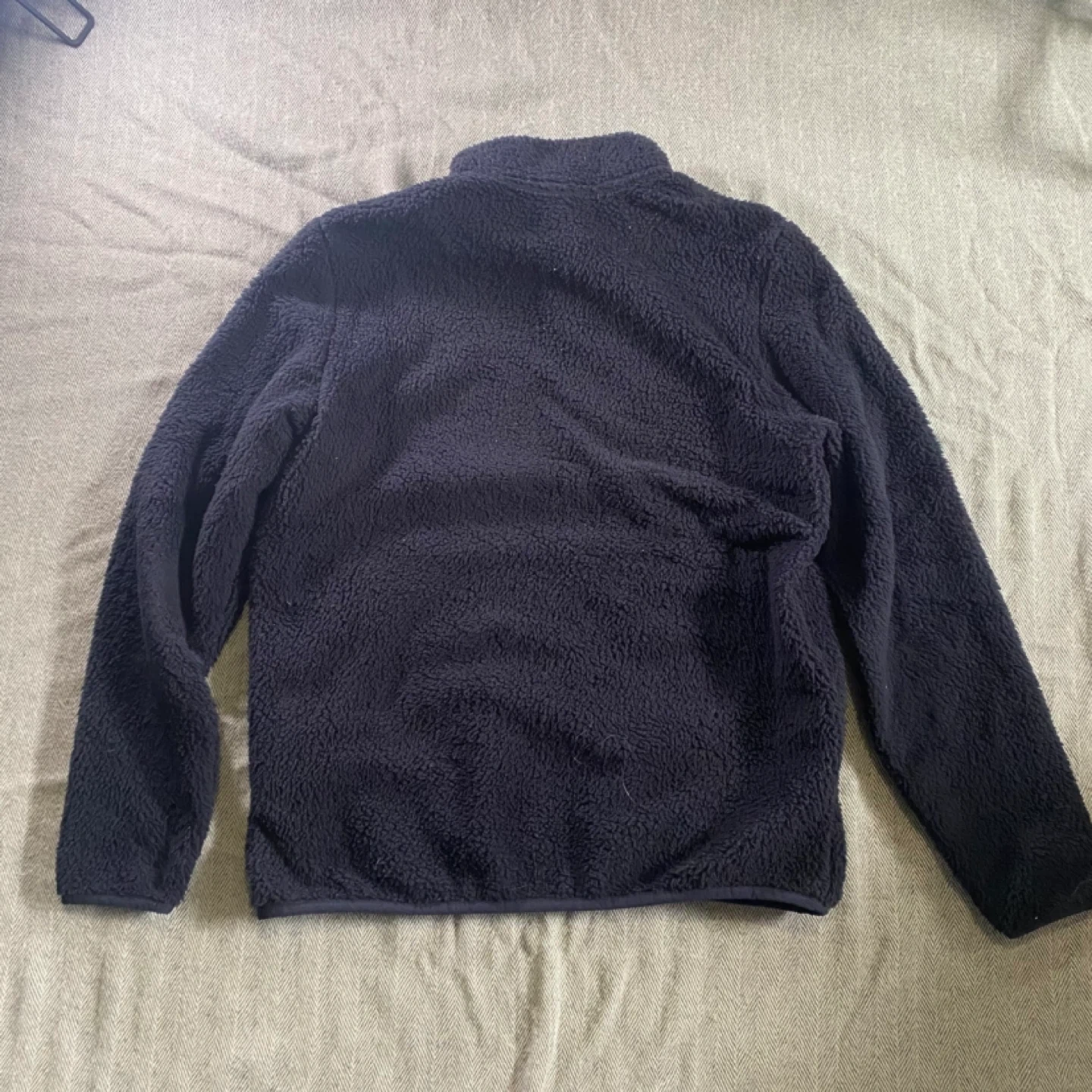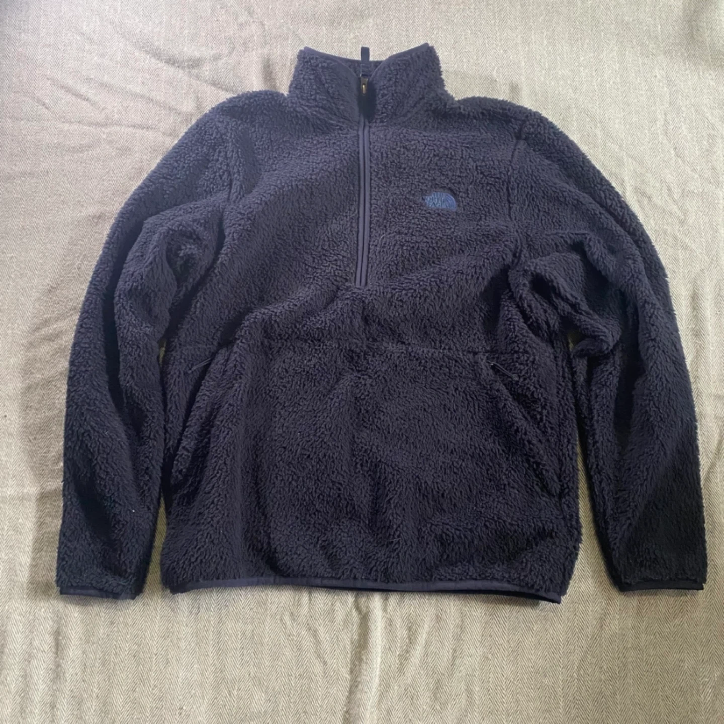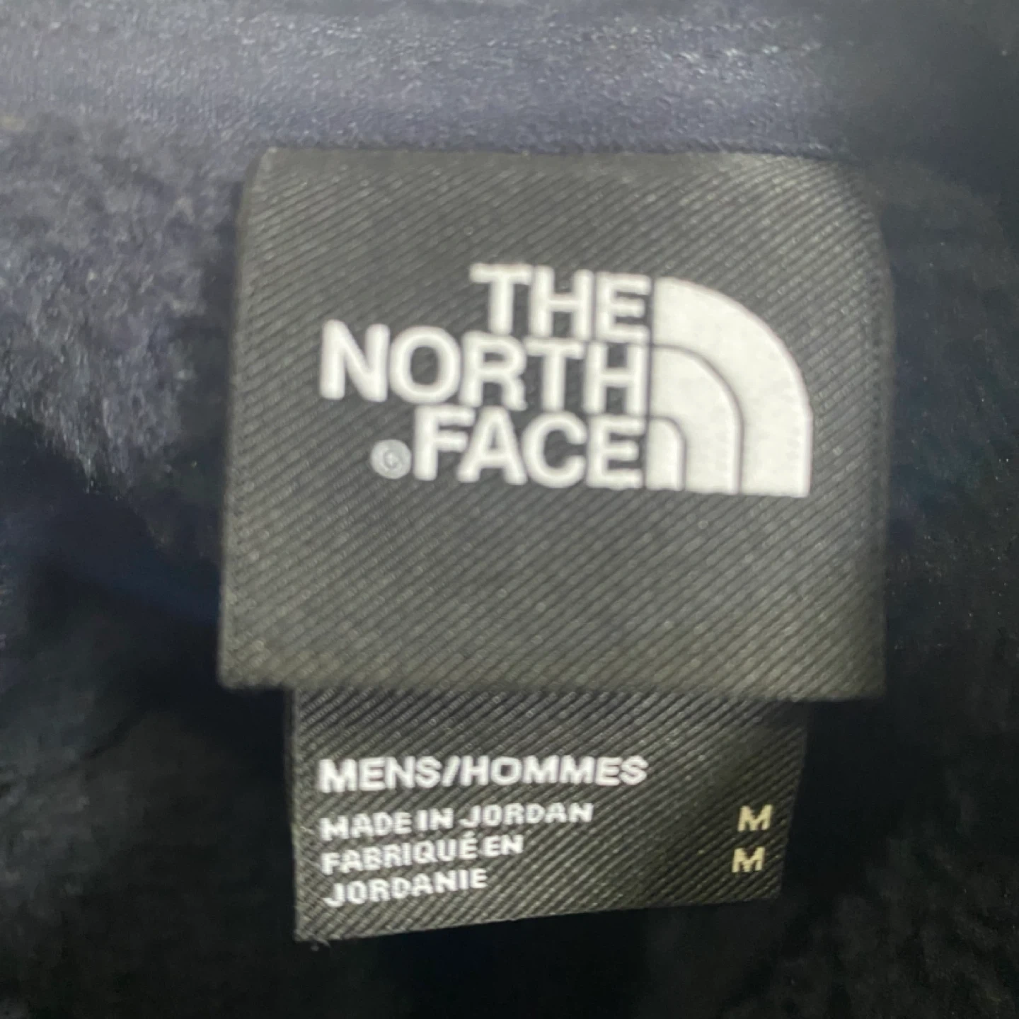 This is a navy blue, quarter-zip fleece pullover 1/4 zip from The North Face. It's a men's size medium, made in Jordan. This cozy fleece is perfect for layering on cooler days!