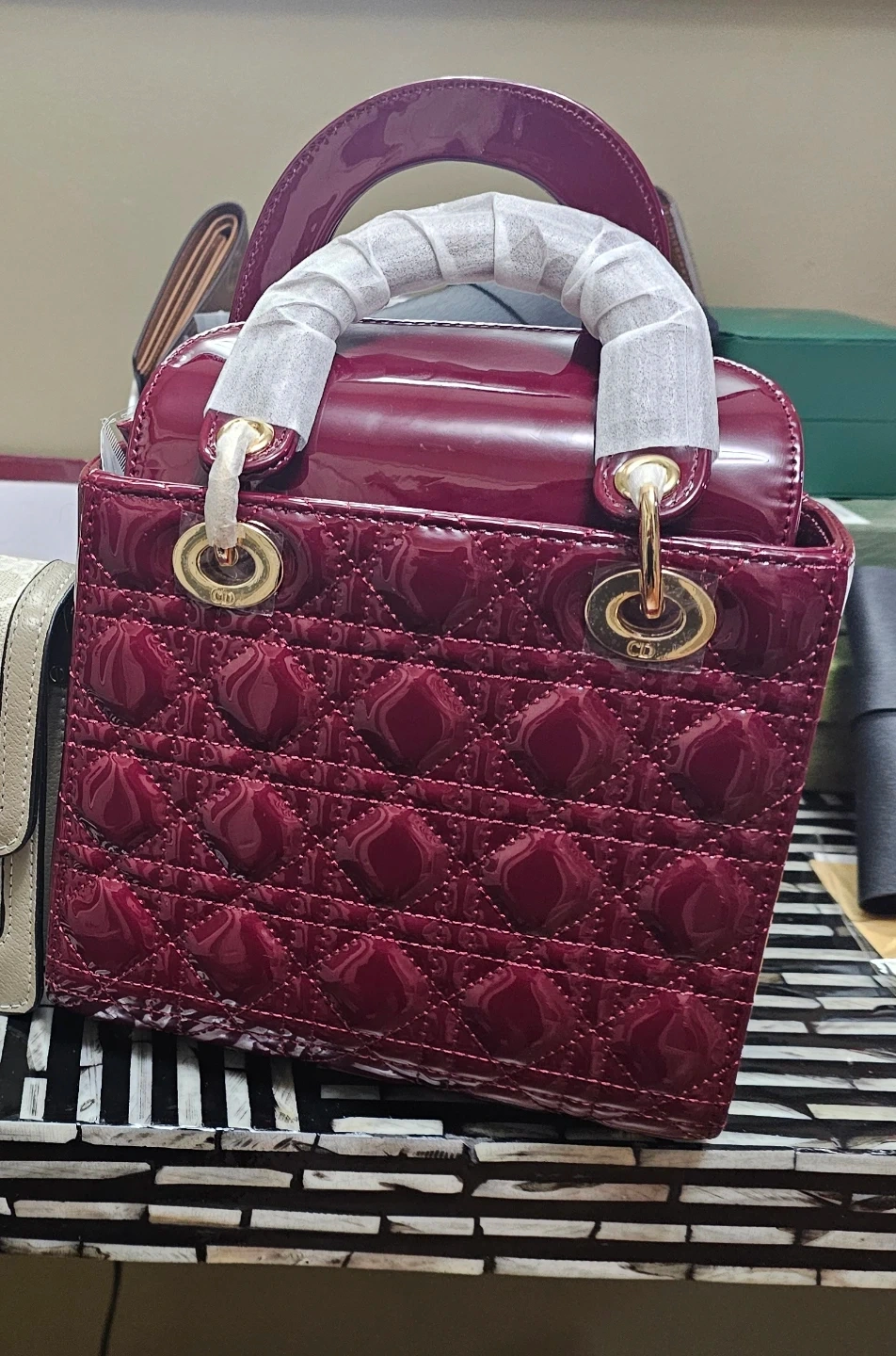 A stunning deep red patent leather Lady Dior handbag. It features the iconic cannage stitching and gold-tone hardware. Includes a detachable shoulder strap.