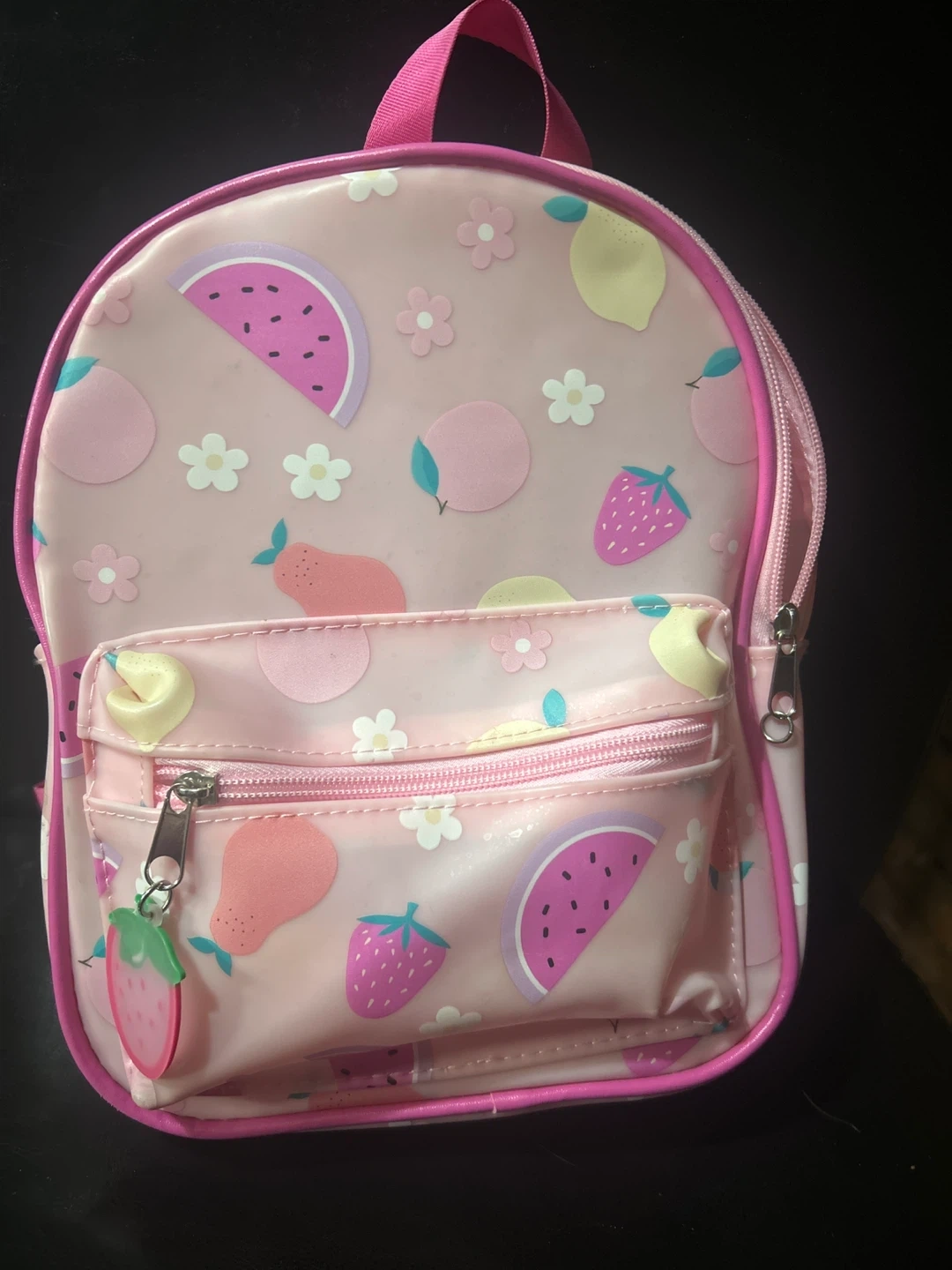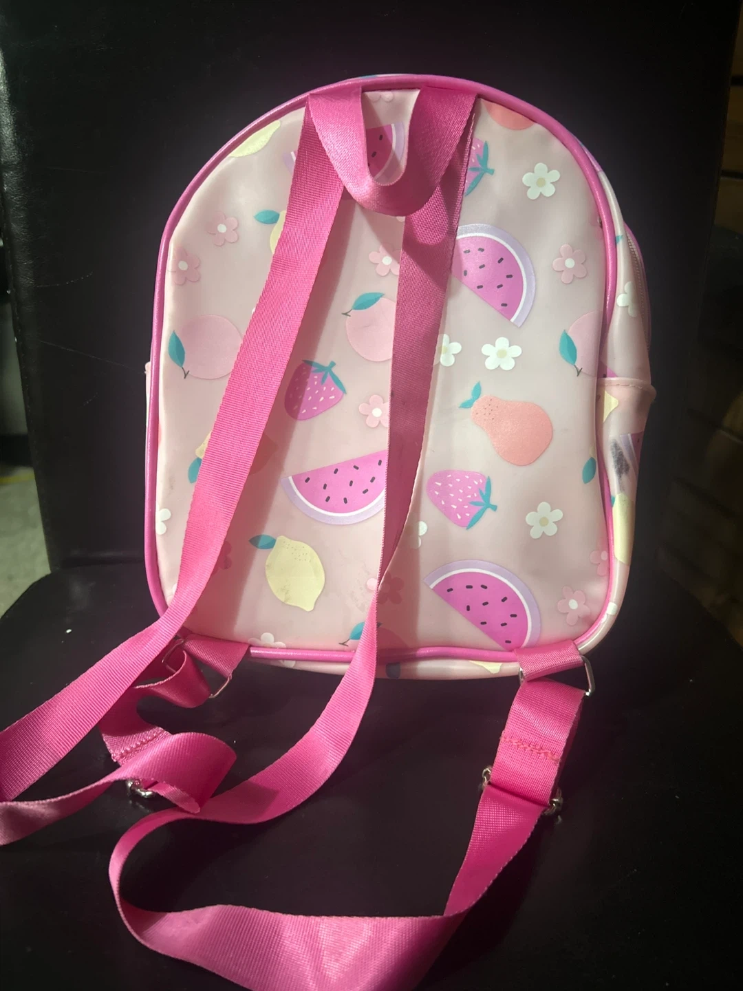 Cute pink backpack with a fun fruit print design. Features adjustable straps and a front zippered pocket. It's perfect for carrying essentials for school or outings!