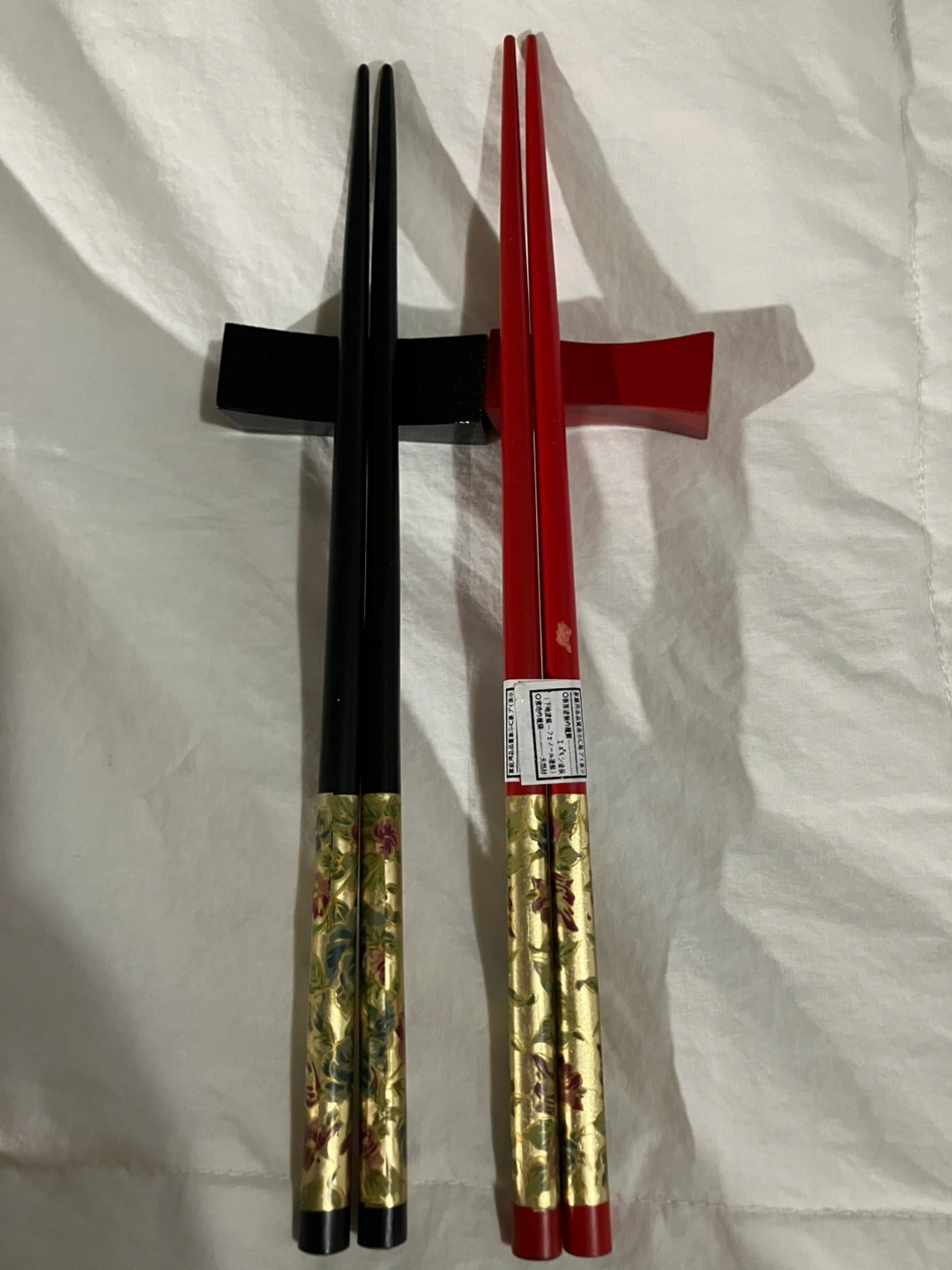 Selling a pair of Japanese chopsticks, one black and one red. They have a beautiful floral design on the gold handles. Perfect for sushi night or adding a touch of elegance to your dinner table!