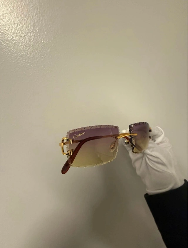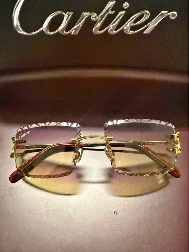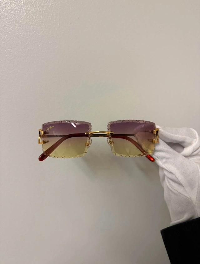Brand new Cartier Big C Frames in Gold. Features purple/yellow gradient tint with X Diamond Cut Lenses. Comes with Cartier case, booklet, and certificate of authenticity. π