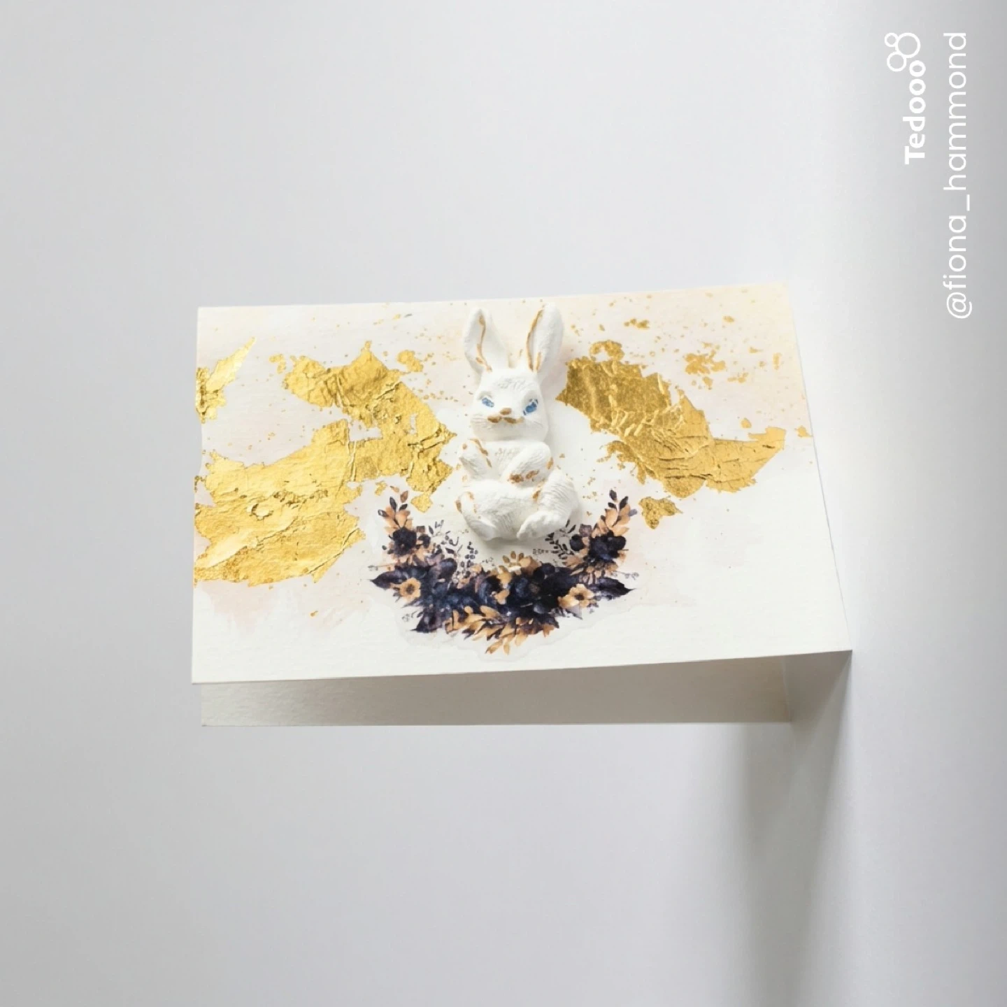 A handmade greeting card featuring a 3D white bunny with blue eyes, surrounded by dark floral accents and gold leaf details. This unique card is perfect for Easter or any special occasion. Blank inside for your personal message.
