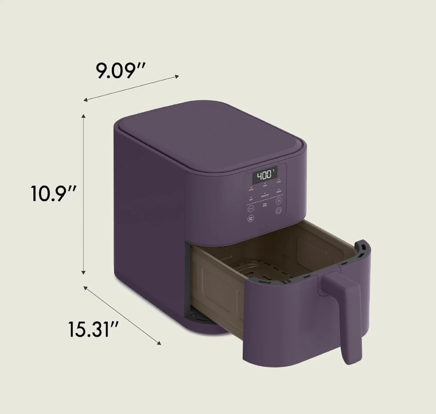 This is a purple air fryer. Dimensions are 9.09" x 10.9" x 15.31". It has a digital display showing 400 degrees Fahrenheit. It's great for quick meals!