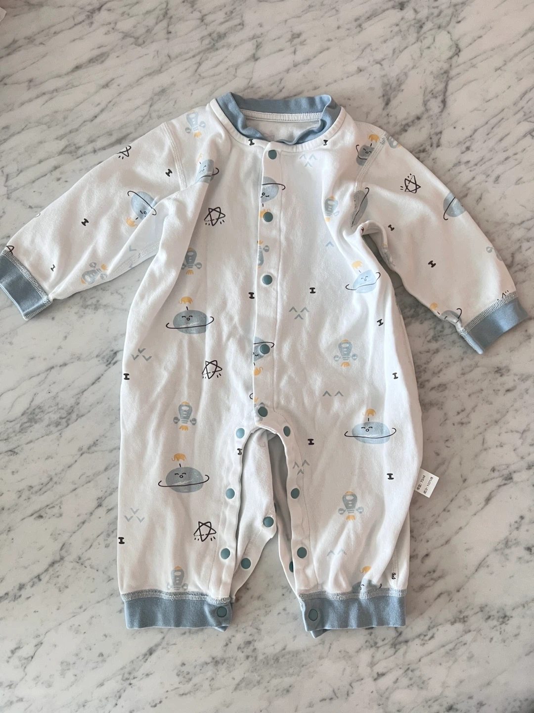 A set of three baby sleepers in size 6 months. Includes two simple joys footed zippered sleepers with animal and sun prints, and one snap-button sleeper with a cloud and rocket design.