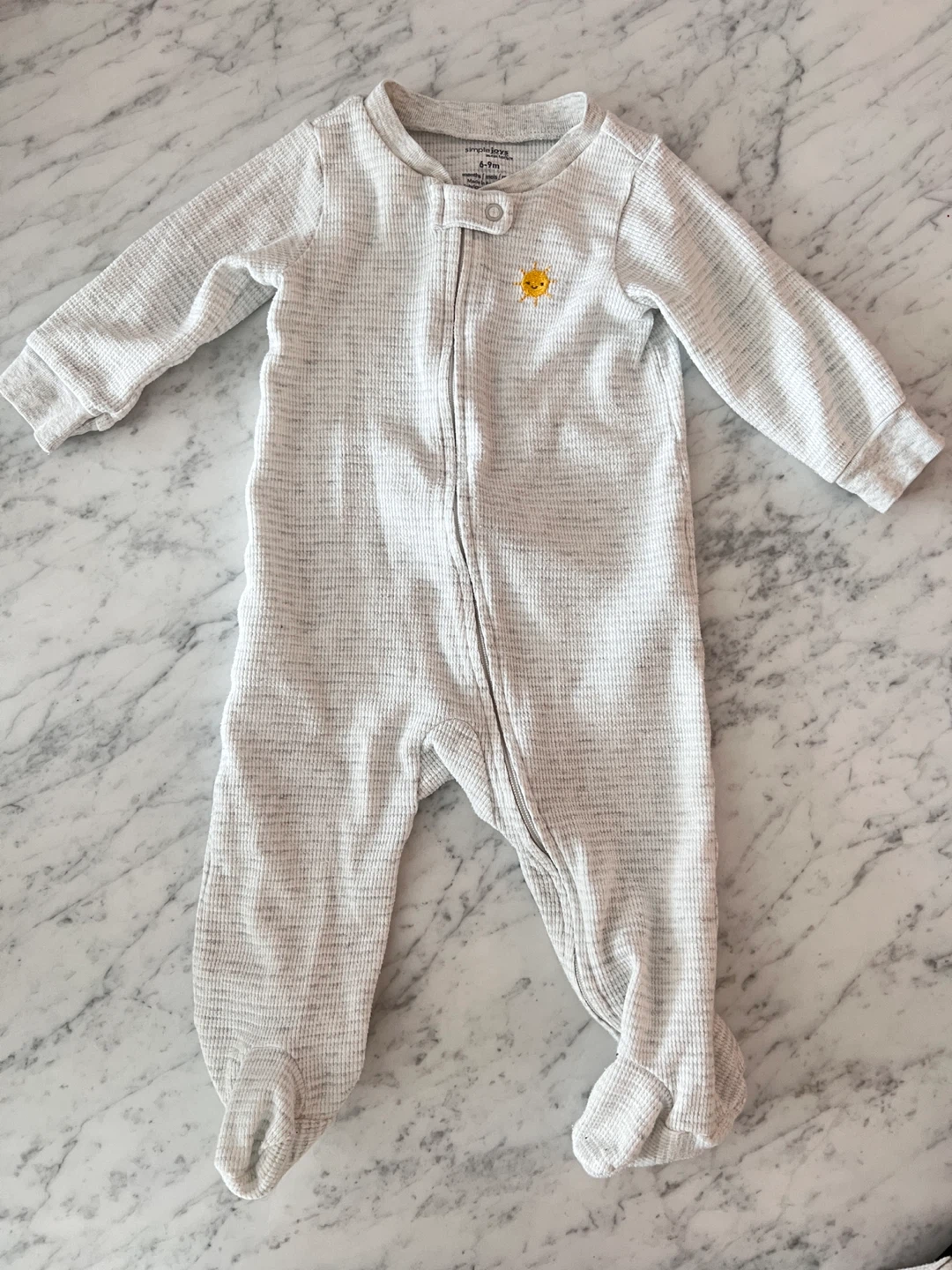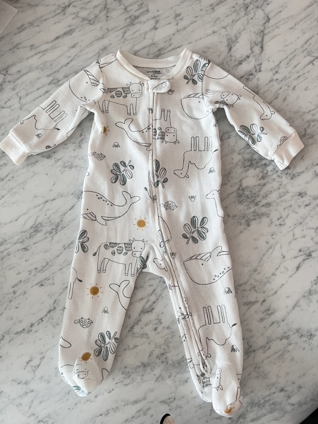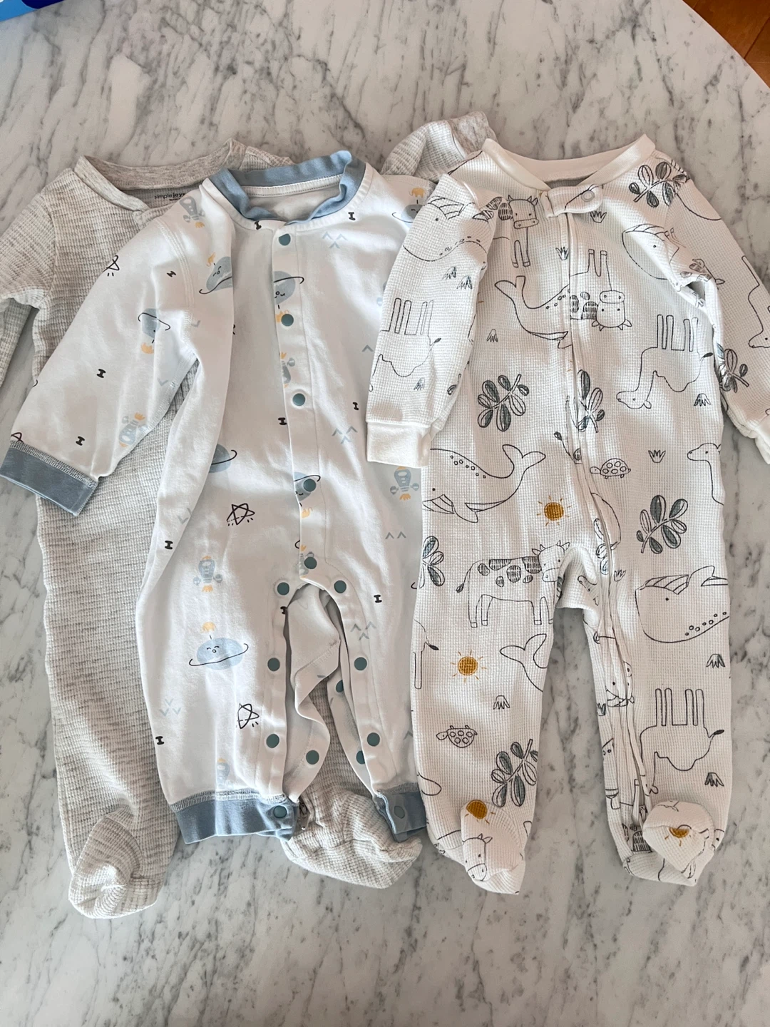A set of three baby sleepers in size 6 months. Includes two simple joys footed zippered sleepers with animal and sun prints, and one snap-button sleeper with a cloud and rocket design.