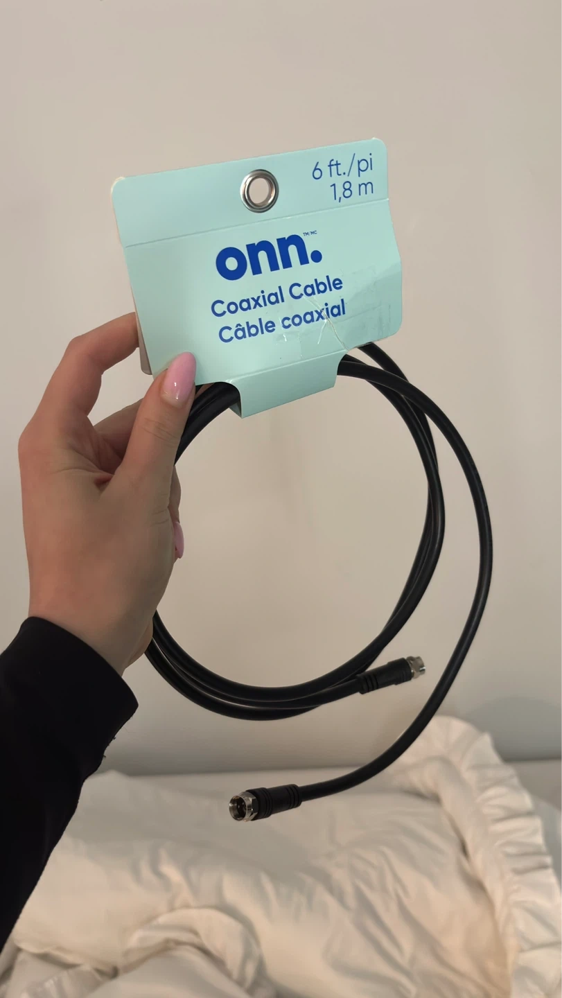 This is an onn. coaxial cable that's 6 feet long. It's a black cable with standard coaxial connectors. Useful for connecting TVs or other devices that require a coaxial input. Pick up Lougheed mall