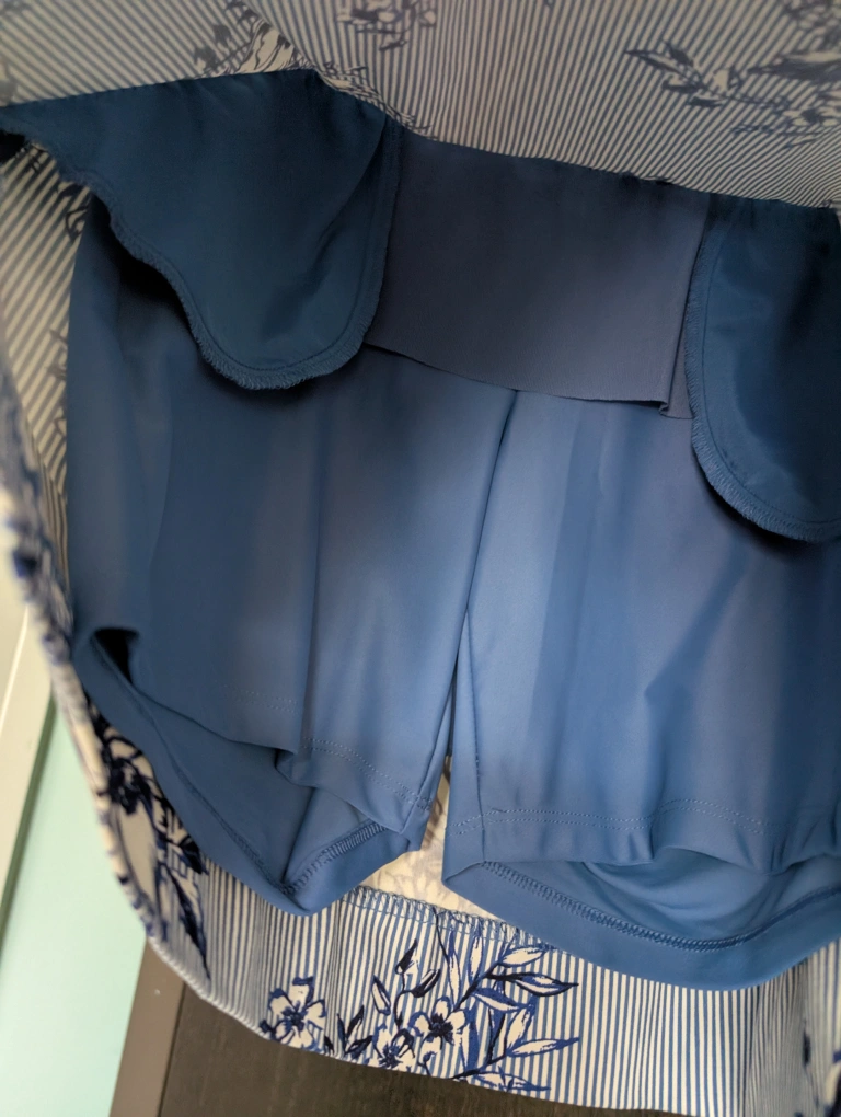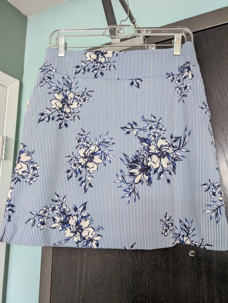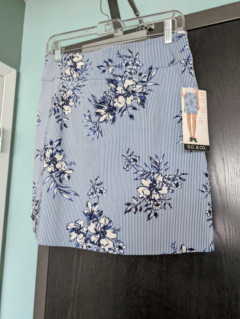Selling a brand-new, unworn, cute S.C. & Co. skirt in size 4! The material is stretchy, so can probably fit up to a size 6. It features a lovely floral pattern on a blue and white striped background. The blue bike shorts underneath the skirt make these great for hiking or biking. Perfect for a sunny day out or a casual event