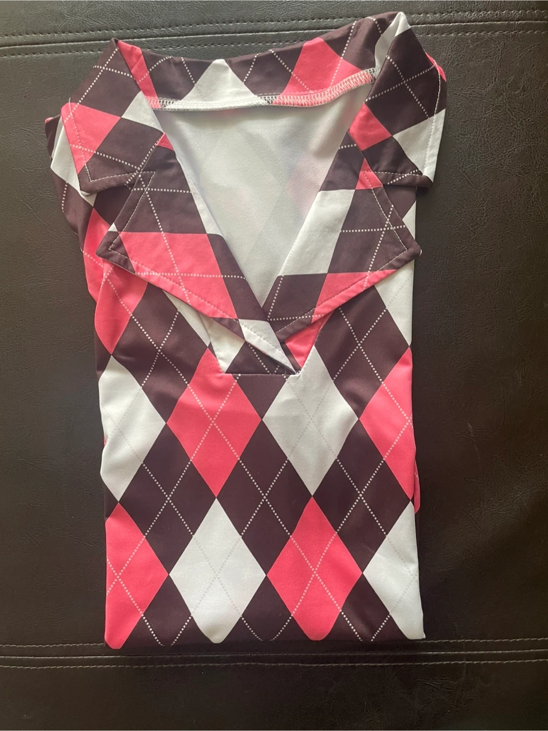 NEVER BEEN WORN long sleeve top with collar, in a cool argyle pattern! It features shades of pink, brown, and white in a diamond design. Very soft to the touch. Longer in length in the back (a shirt tail hemline) to stay tucked in when bending (like when golfing). 18” armpit to armpit (selling because it runs large). Size: Small on tag, but fits larger 95% polyester 5% spandex From a pet and smoke free home.