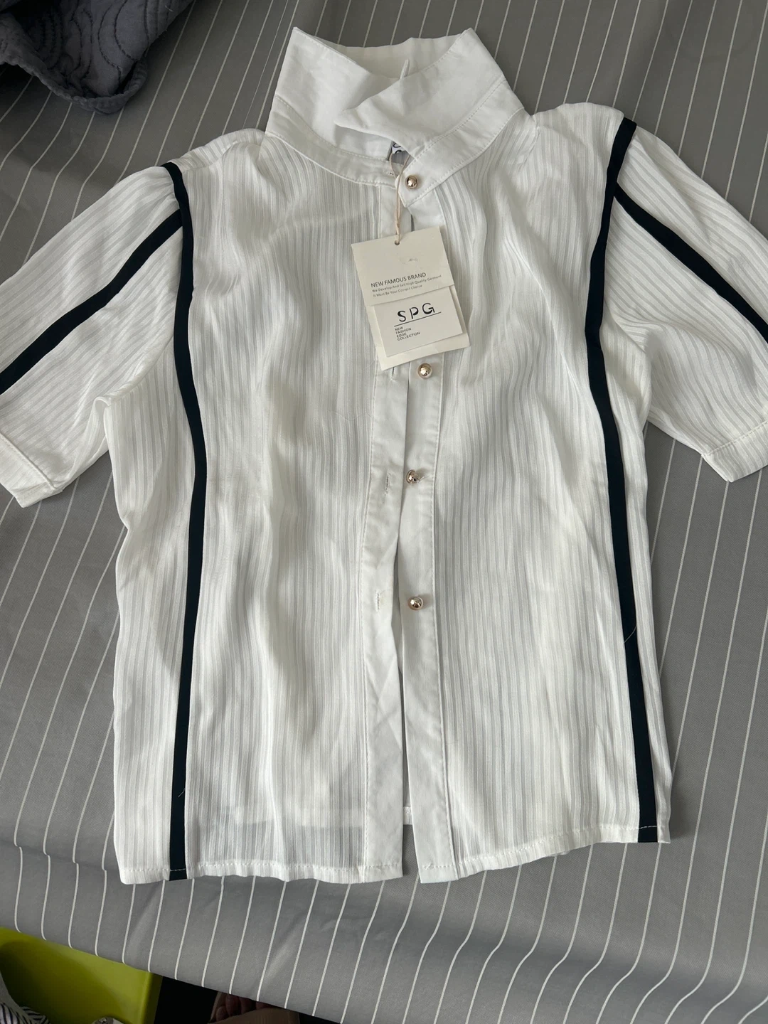 131Selling a brand new S.P.G. blouse! It's white with black accents and has a unique collar design. The tag is still attached, so it's in perfect condition. Perfect for a stylish and crisp look!