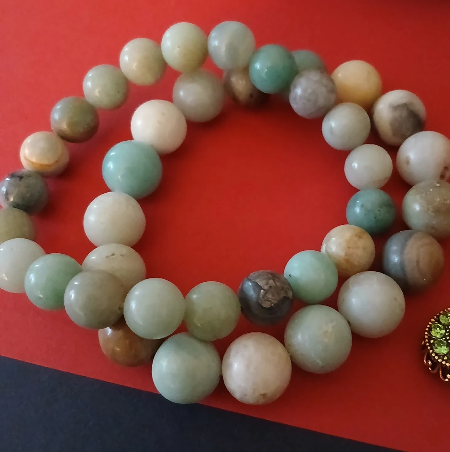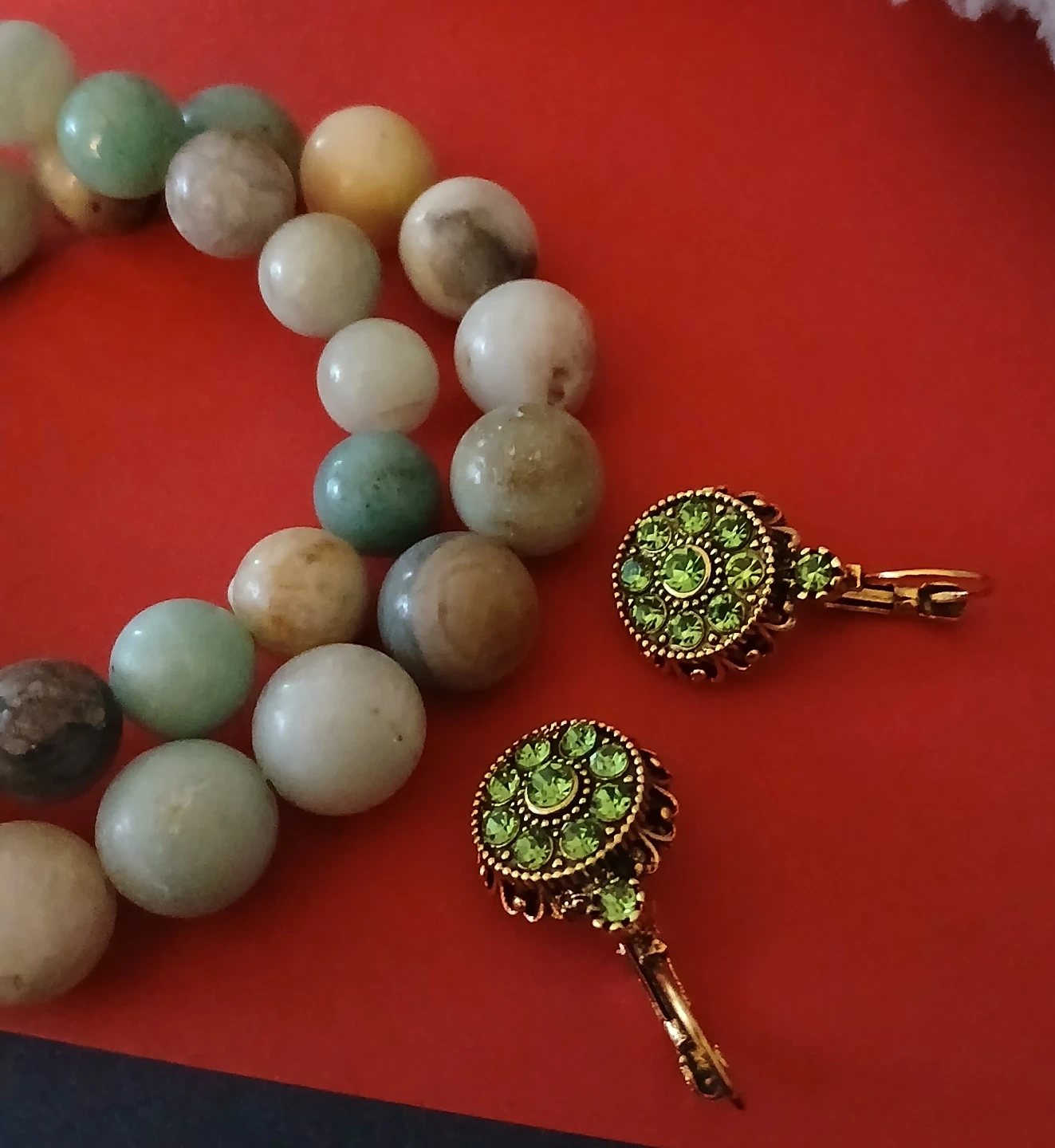 Beautiful vintage-inspired earrings featuring green stones and intricate gold-tone metalwork. These dangle earrings have a lever-back closure for secure wear. They're perfect for adding a touch of elegance to any outfit! The stones appear to be faceted glass or similar. 2 stone stretchy bracelets