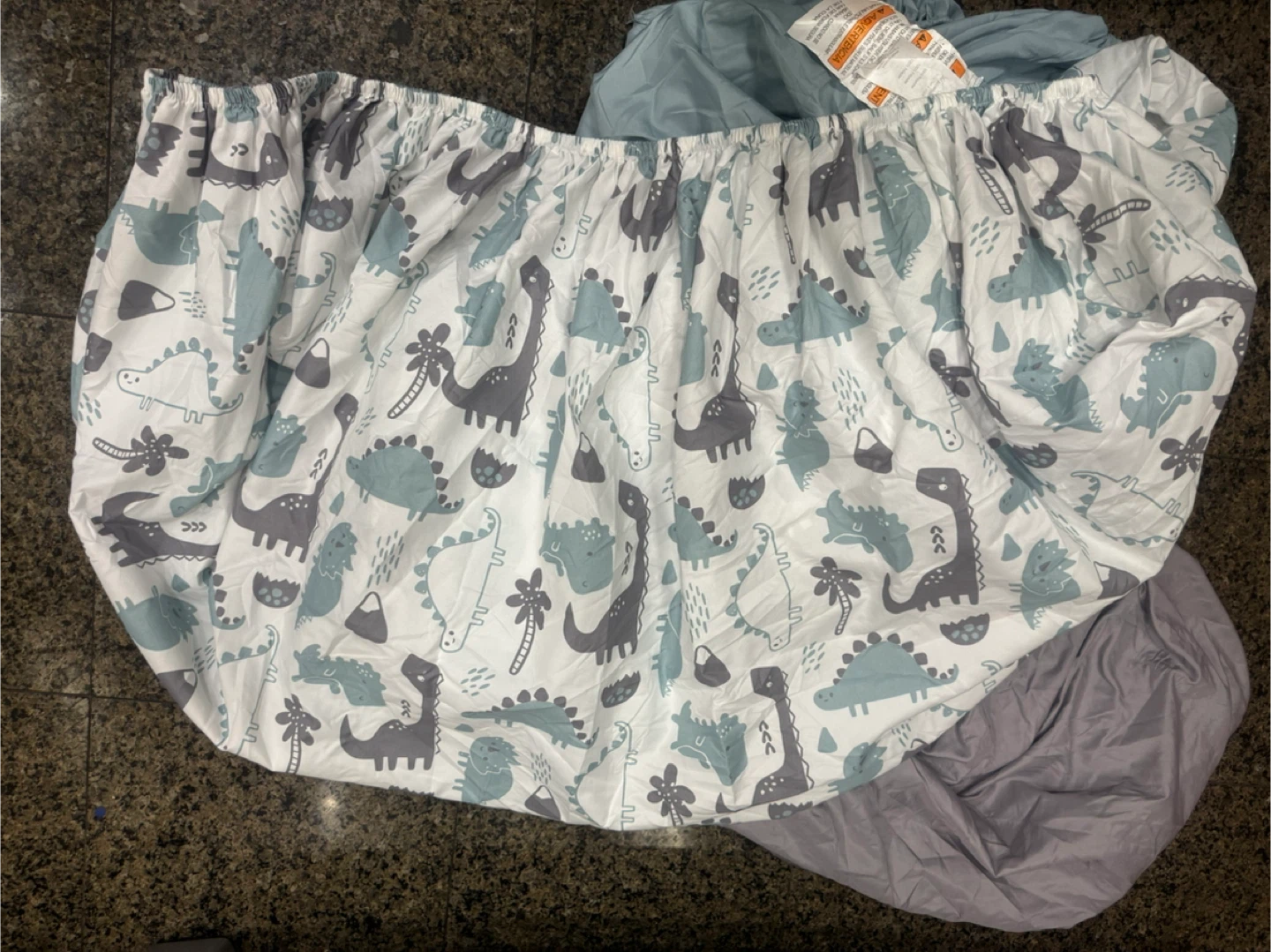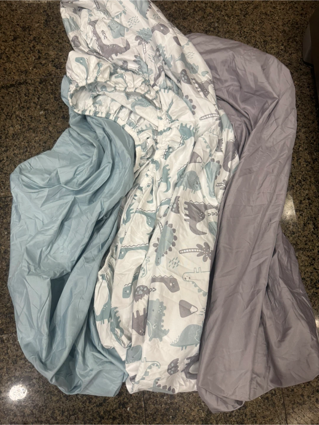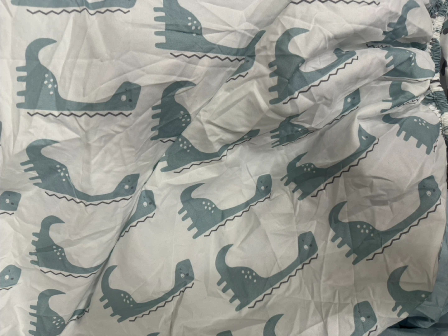Four fitted crib sheets in a dino print and solid colours. Made of 100% polyester. Fits standard mattresses.