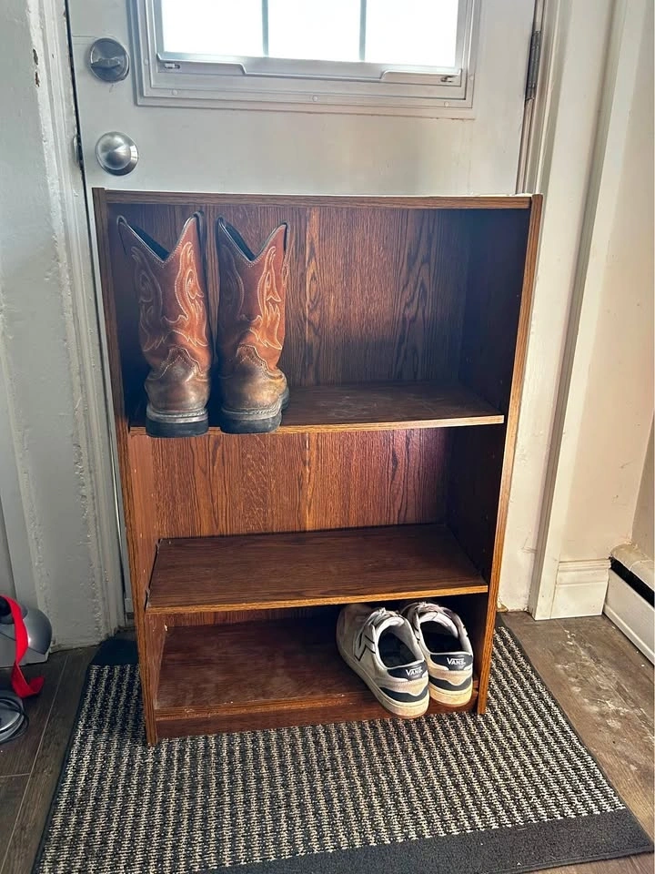 Great working shoe rack with multiple movable shelves, offering plenty of space for shoes or boots. Dimensions: 3ft height x 2ft width x 9 1/4" depth.