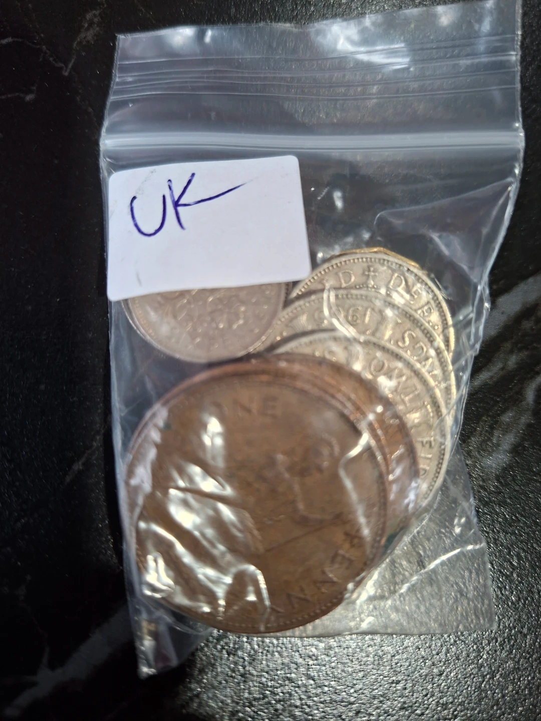 A collection of vintage pre-decimal British coins, including pennies and other denominations. The coins feature portraits of Queen Elizabeth II and other monarchs. Dates range from the early to mid-20th century.