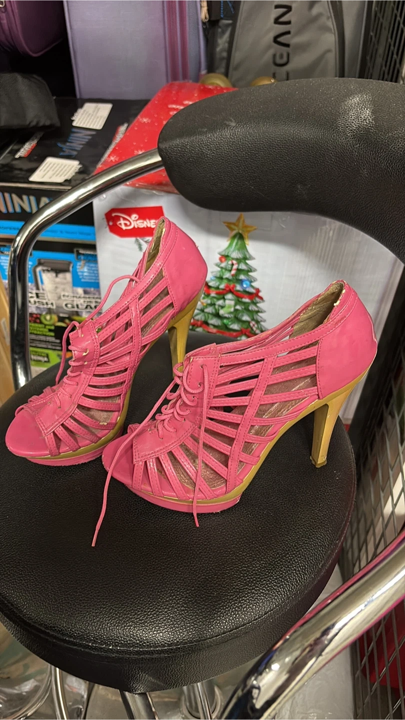 These fashionable pink gladiator heels feature intricate lace-up detailing and a striking gold stiletto heel. They're made of a synthetic material with a peep-toe design. Perfect for adding a pop of colour and flair to an outfit!