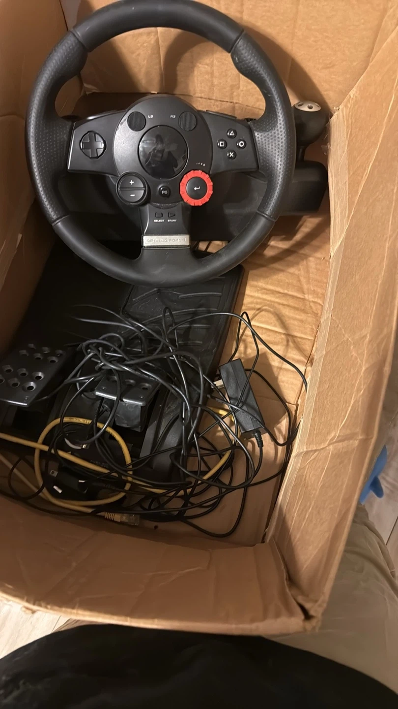 Logitech Driving Force gaming steering wheel with pedals. Includes power adapter and all necessary cables. Great for racing simulations!