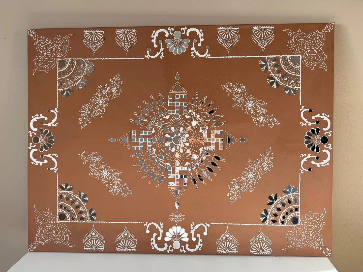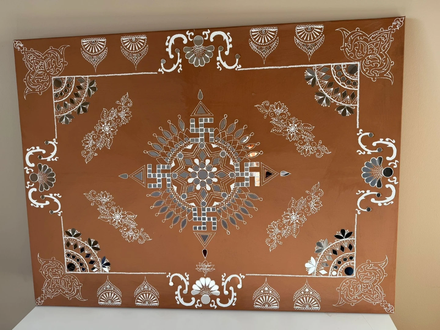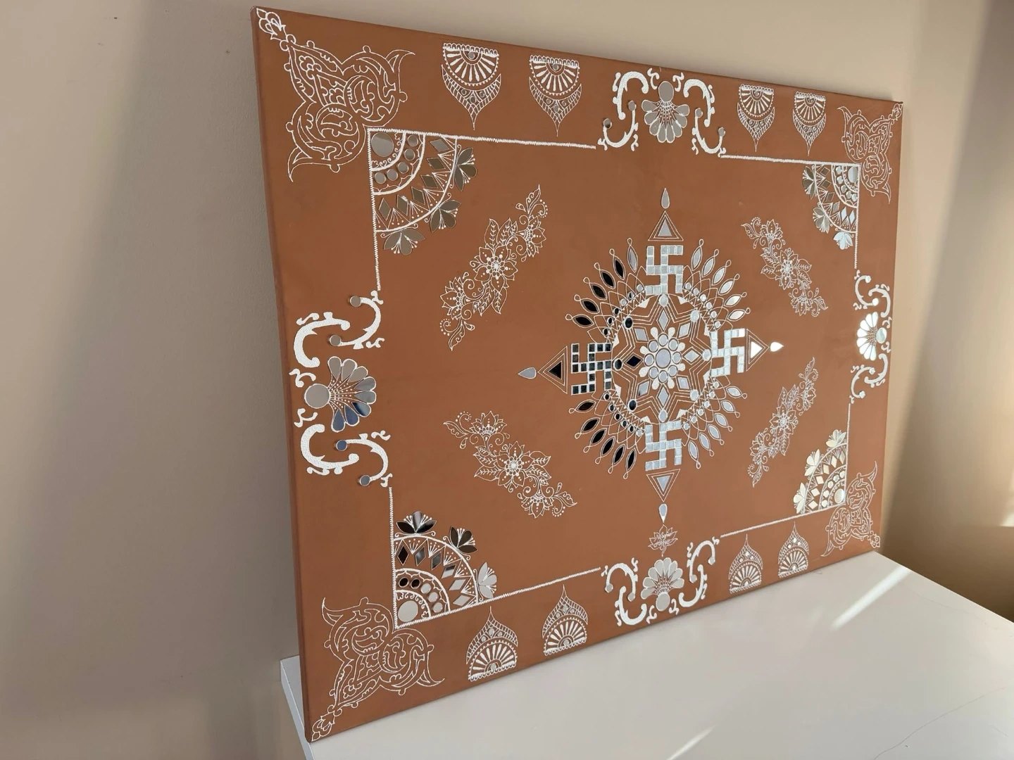 Intricate South Asian folk-inspired mandala with mirrored accents and henna-style detailing. A striking blend of tradition and texture, perfect for home décor, gifting, or meditation spaces.