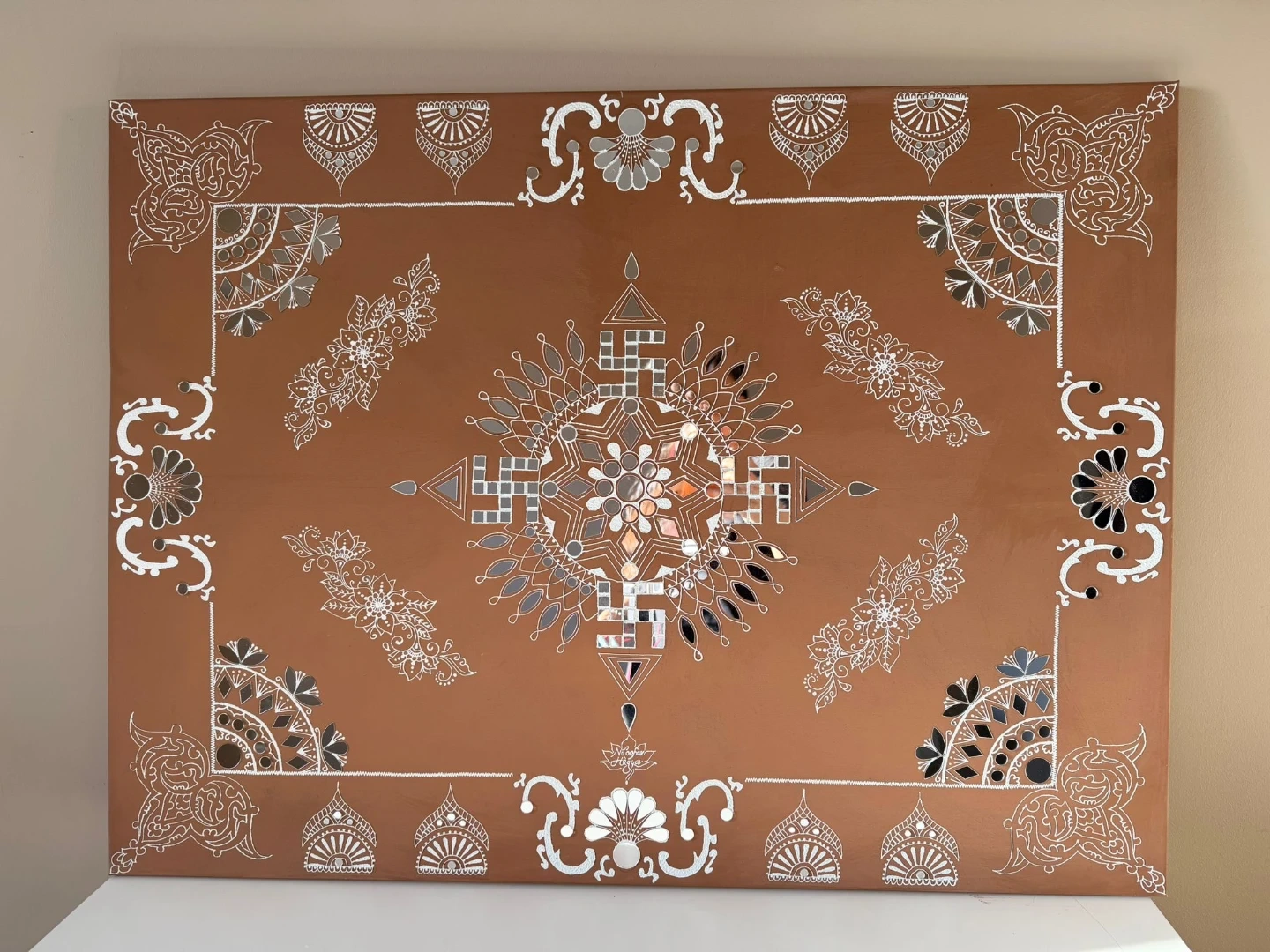 Intricate South Asian folk-inspired mandala with mirrored accents and henna-style detailing. A striking blend of tradition and texture, perfect for home décor, gifting, or meditation spaces.