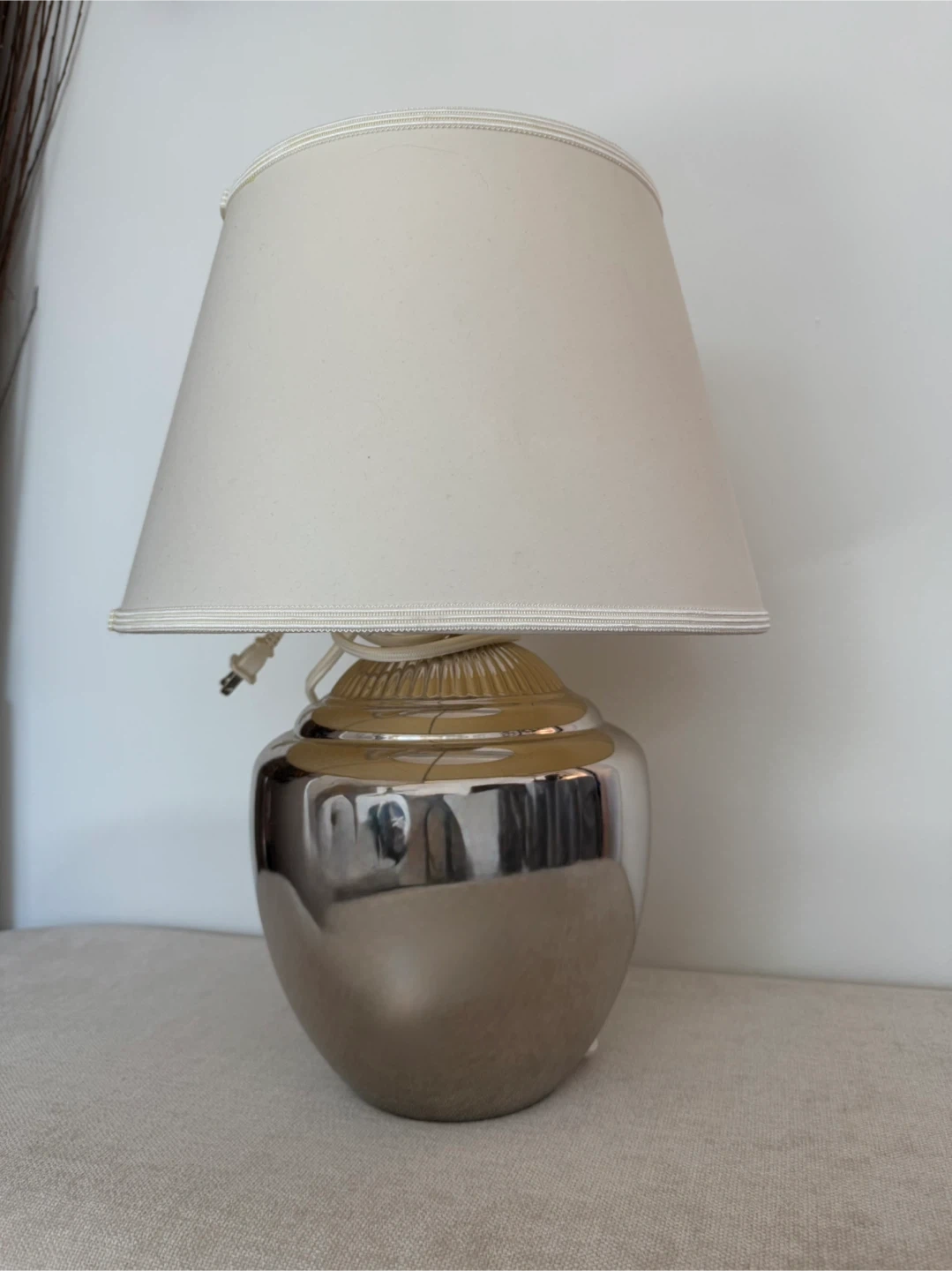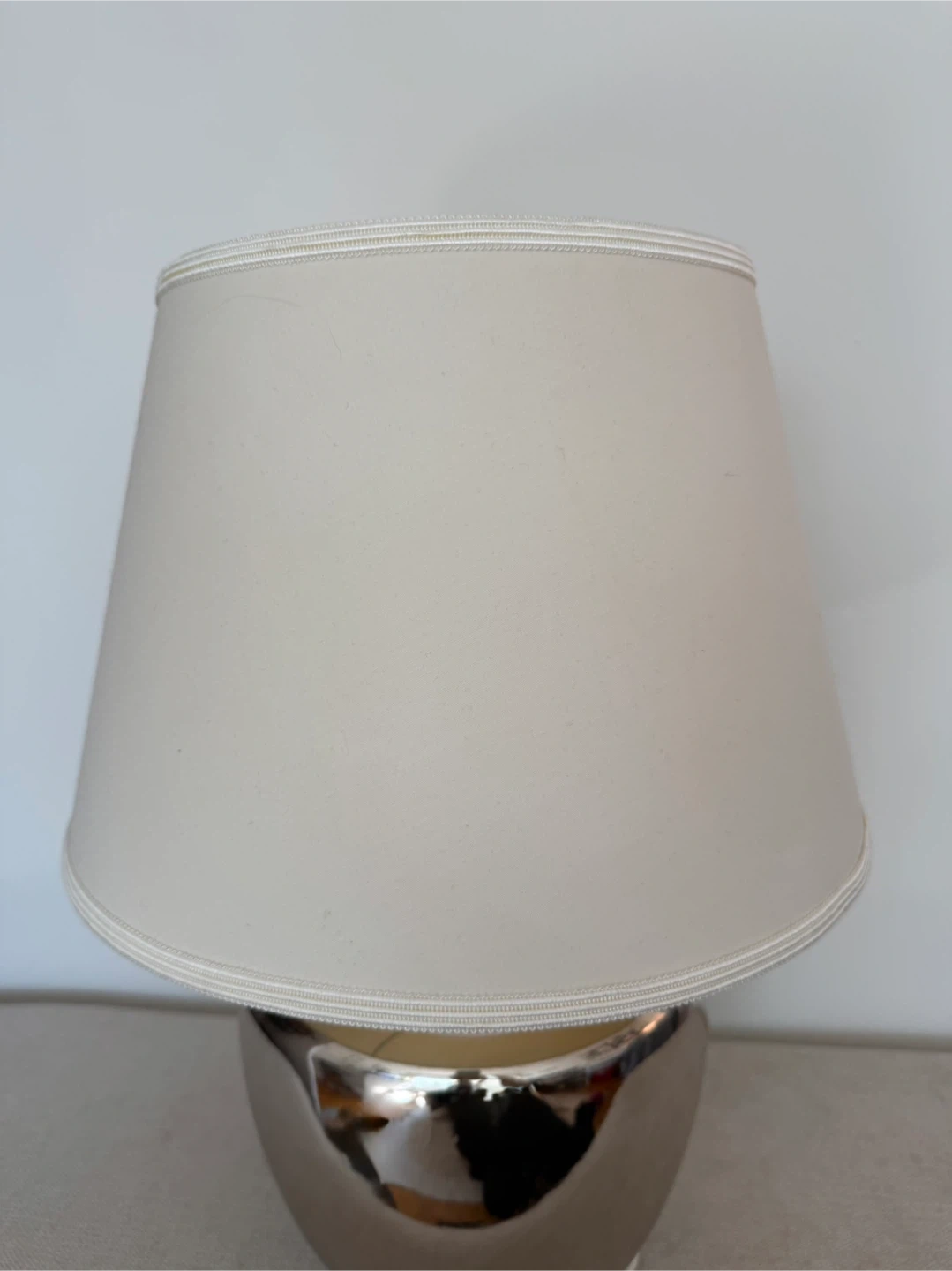 Selling a lovely silver table lamp with a cream-coloured shade.
