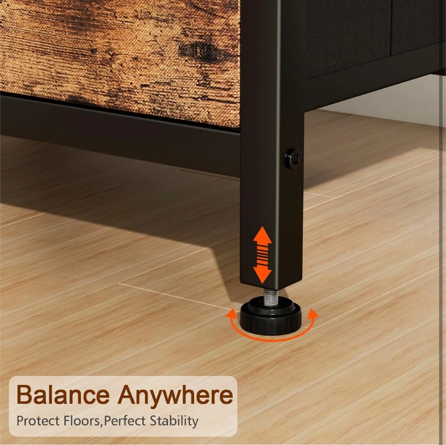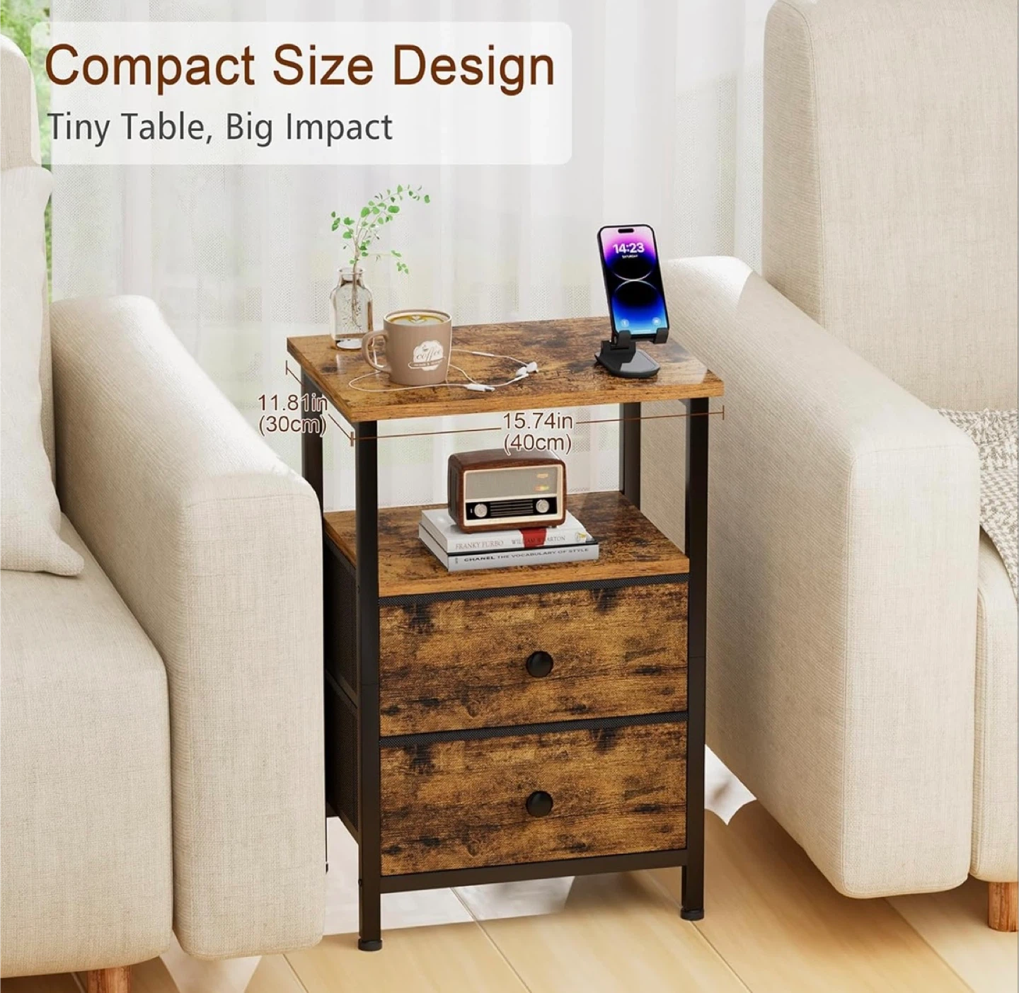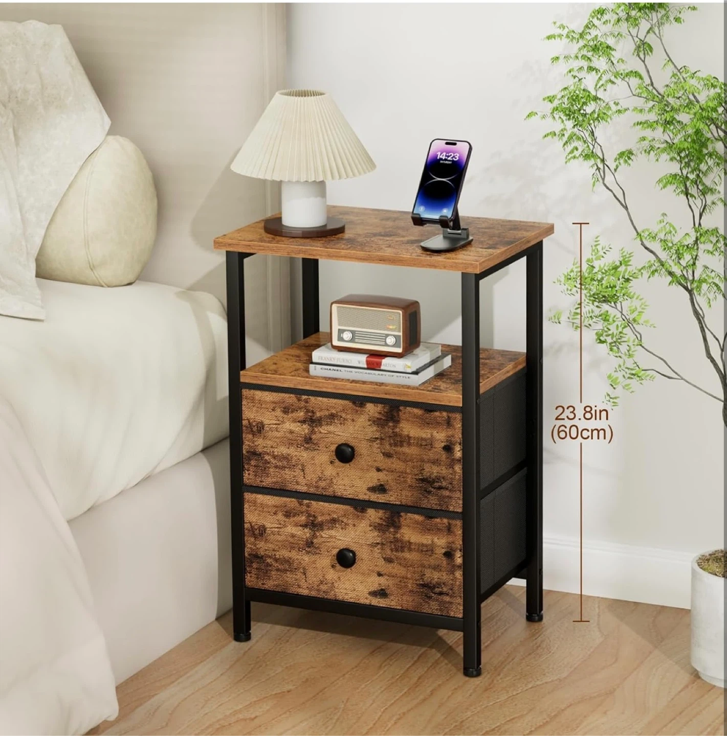 This end table offers cozy fabric storage for bedside clutter. It has a rustic wood-grain finish with a black metal frame. Includes two fabric drawers and an open shelf.