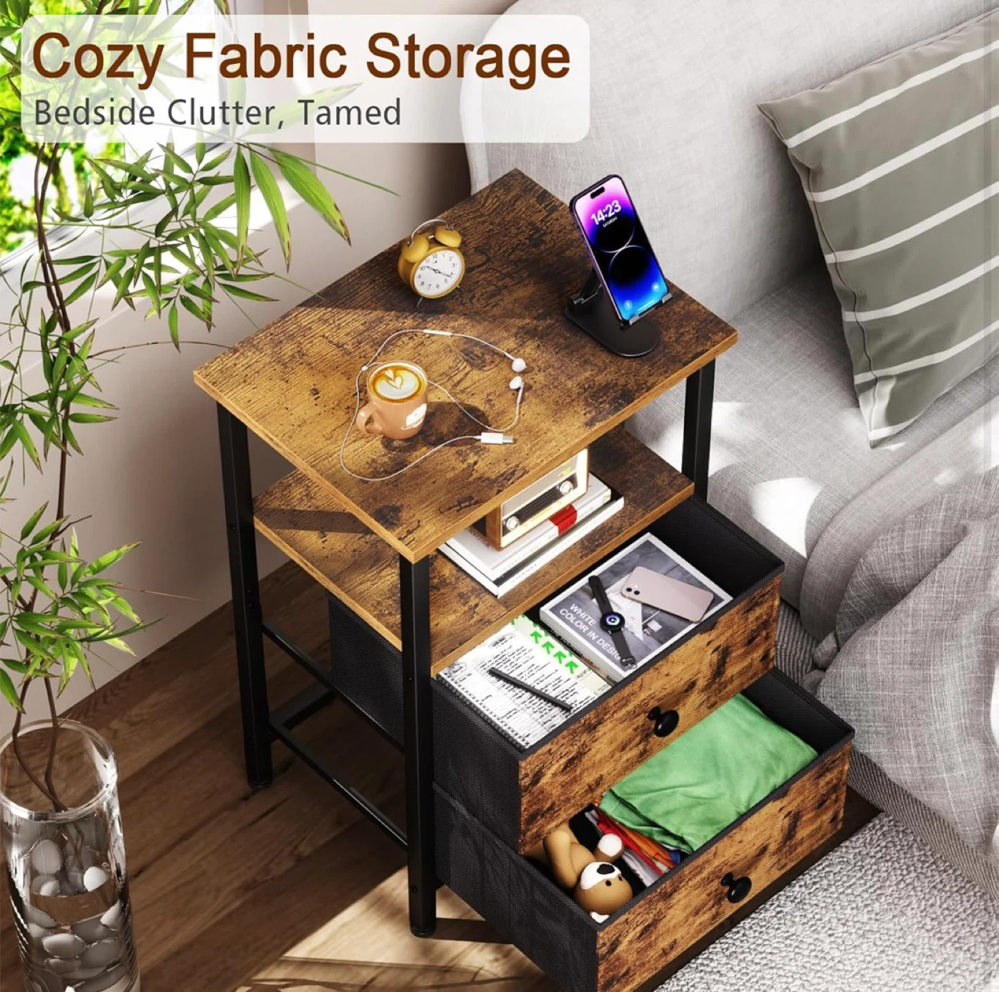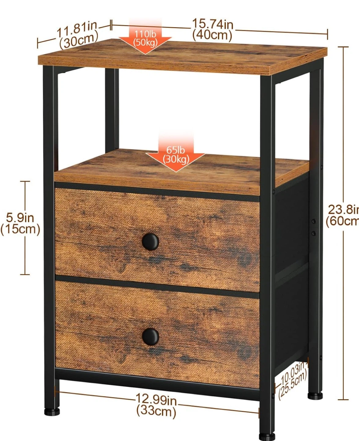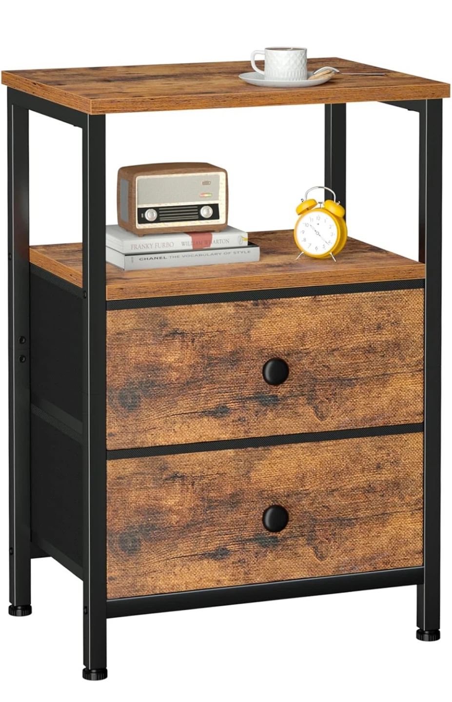 This end table offers cozy fabric storage for bedside clutter. It has a rustic wood-grain finish with a black metal frame. Includes two fabric drawers and an open shelf.