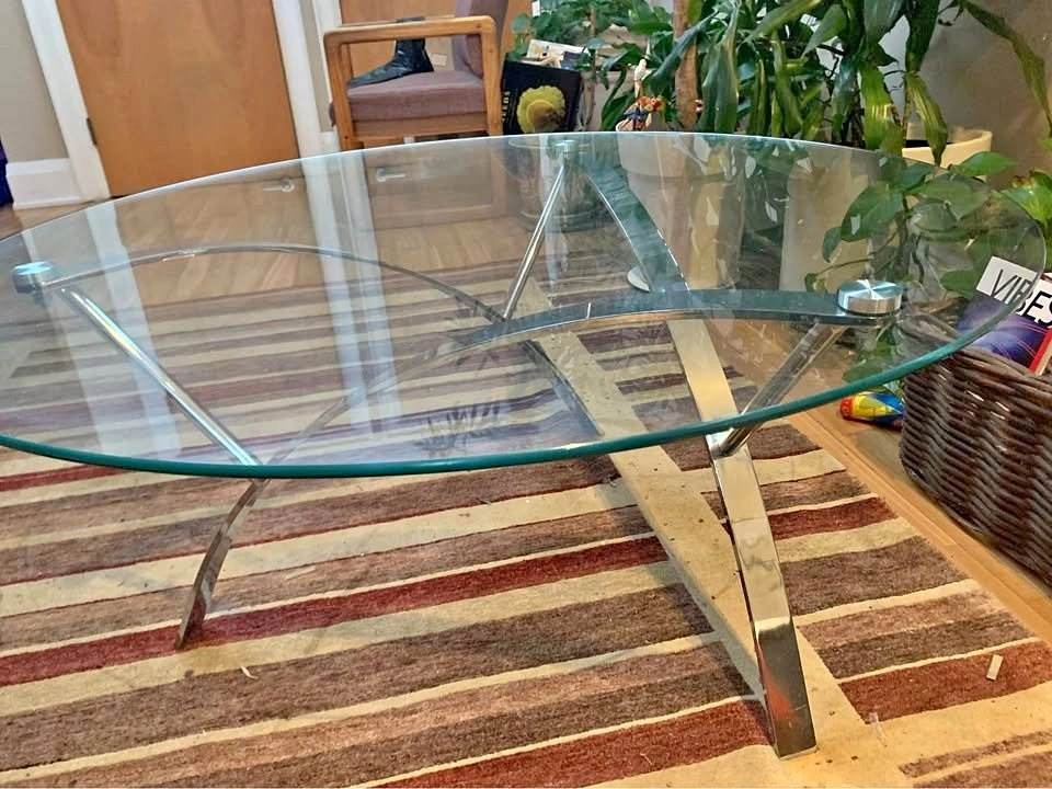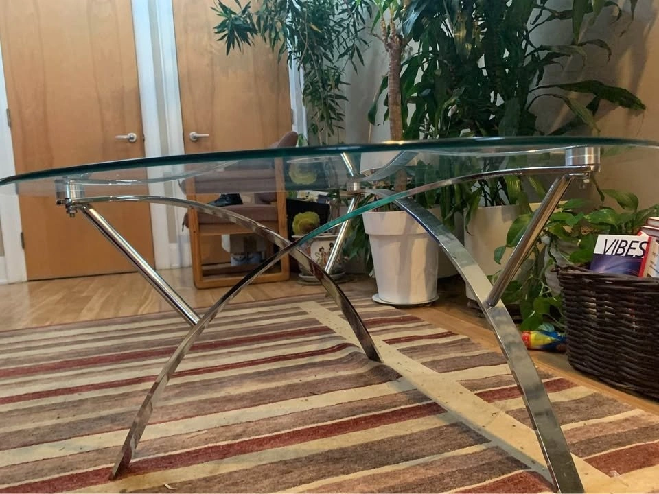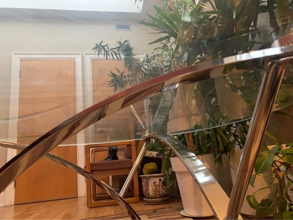 A beautiful addition to your living area. This glass topped coffee table is 39” diameter and 18-1/4” high. The top is sturdily connected to the graceful arching three stainless legs. In perfect condition.