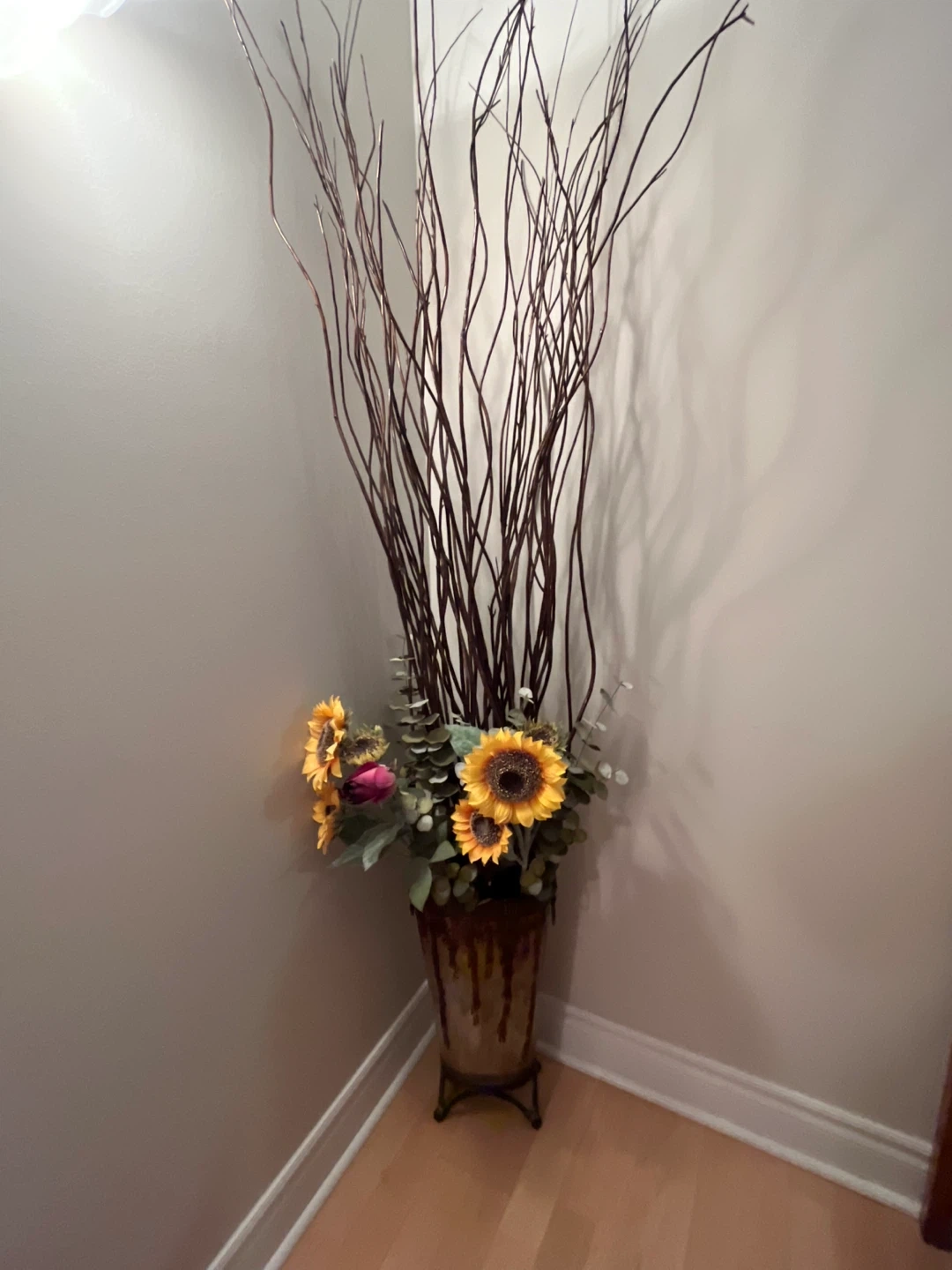 Selling a lovely floral arrangement in a decorative vase. It features sunflowers and other foliage with tall branches, perfect for adding a touch of nature to your home decor.