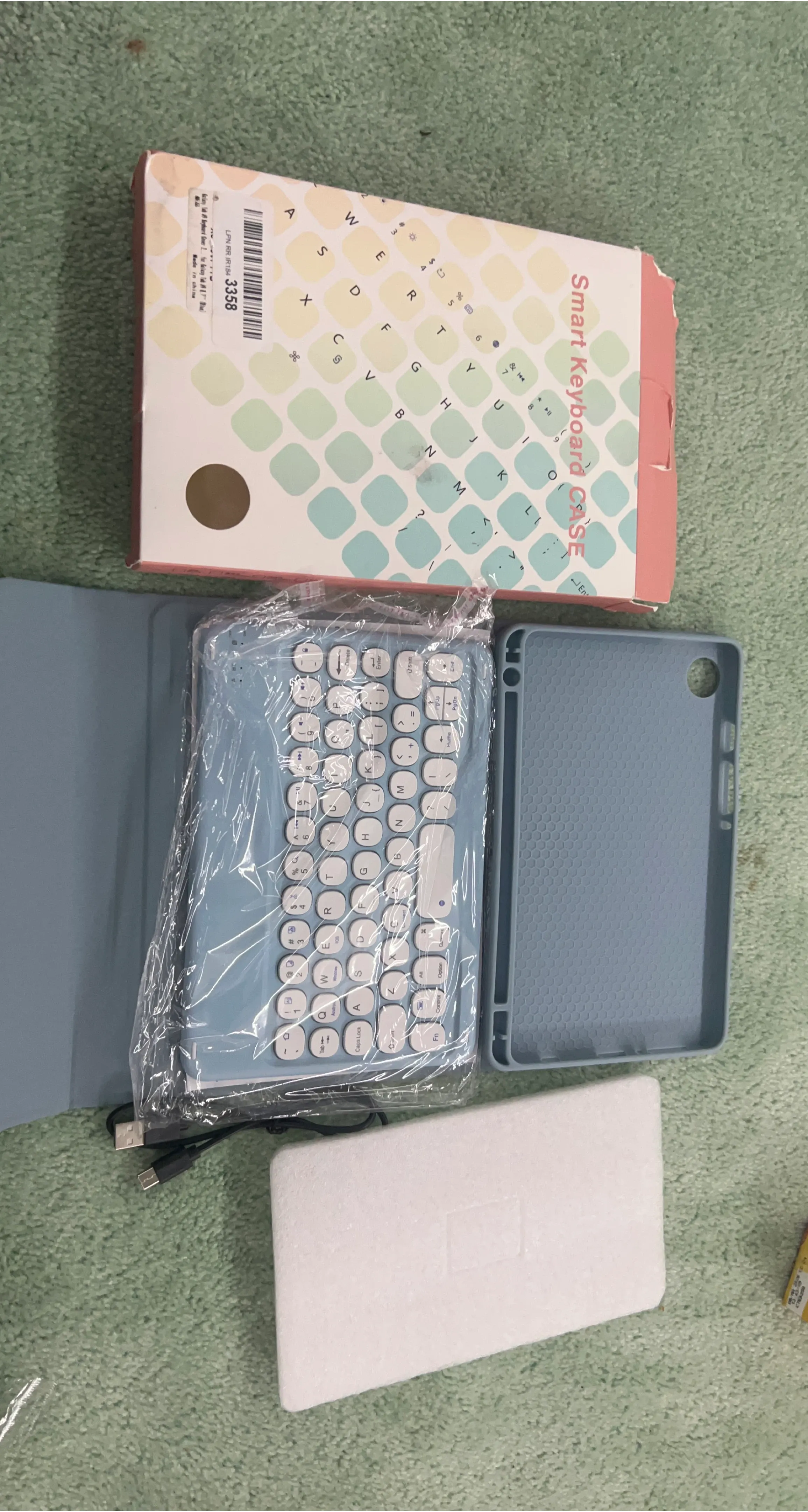 This is a smart keyboard cover designed for the Galaxy Tab A8 8.7". It's blue and includes a protective case for your tablet. Made in China.