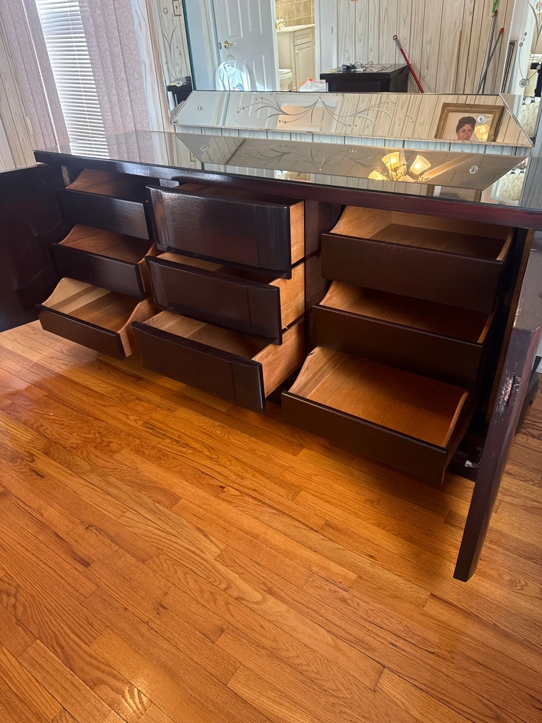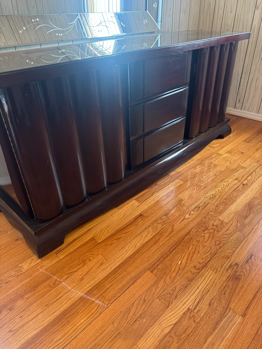 Selling a dark brown wood dresser. It has a unique design with curved details on the sides and plenty of drawer space for storage. It's a beautiful piece to add to any bedroom or living area!