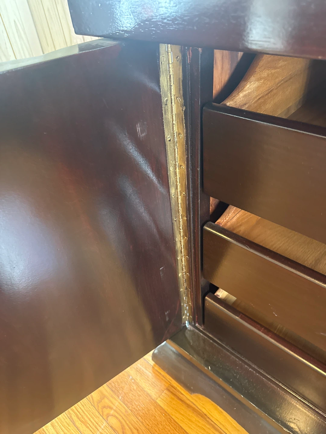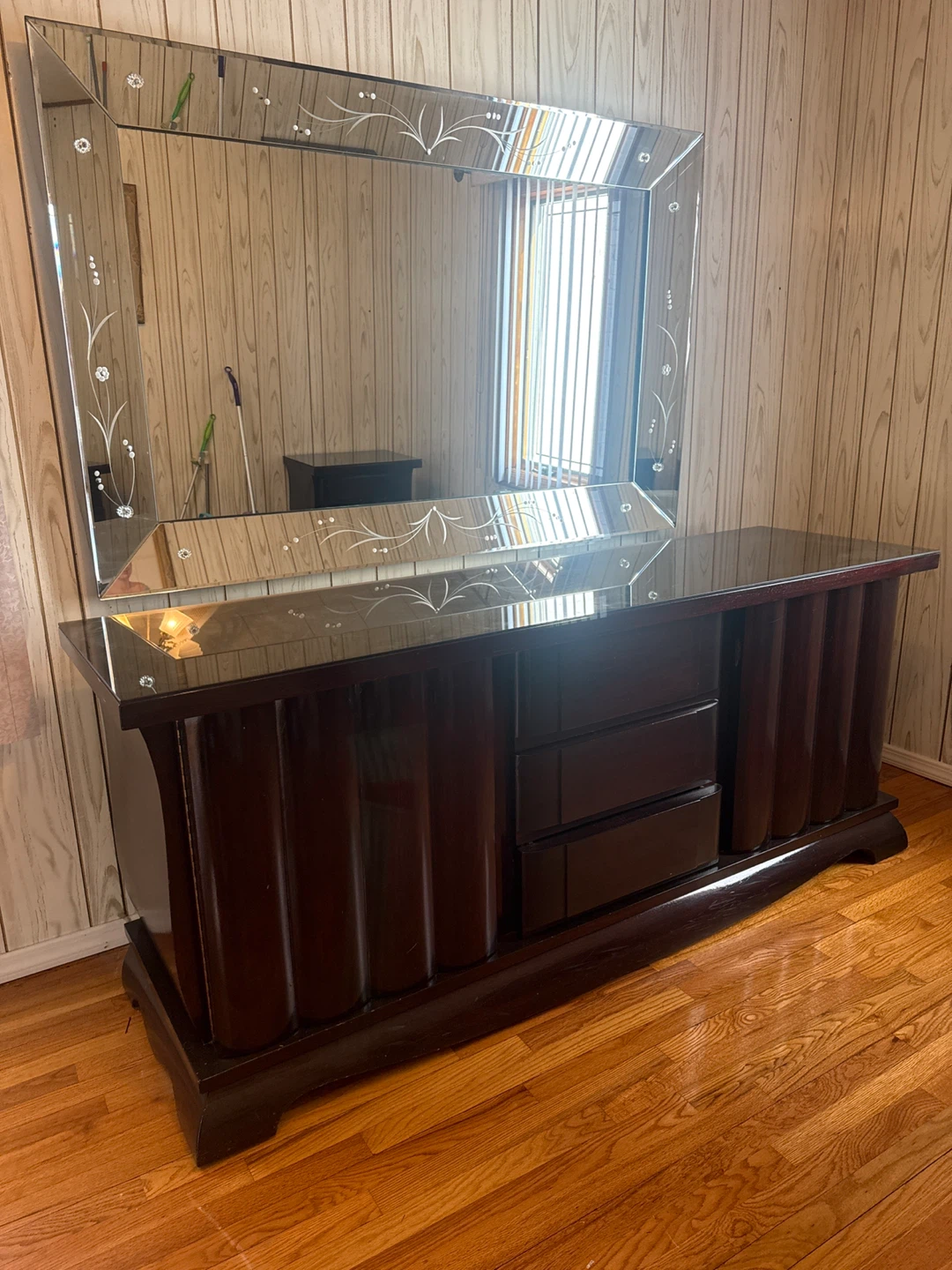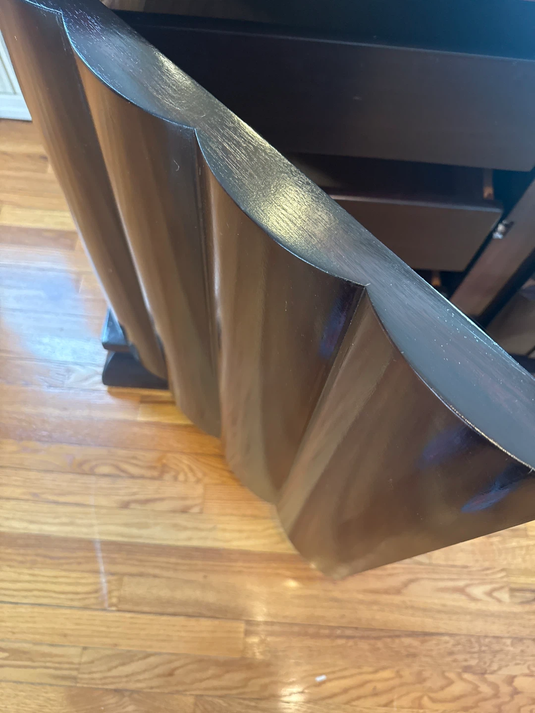 Selling a dark brown wood dresser. It has a unique design with curved details on the sides and plenty of drawer space for storage. It's a beautiful piece to add to any bedroom or living area!
