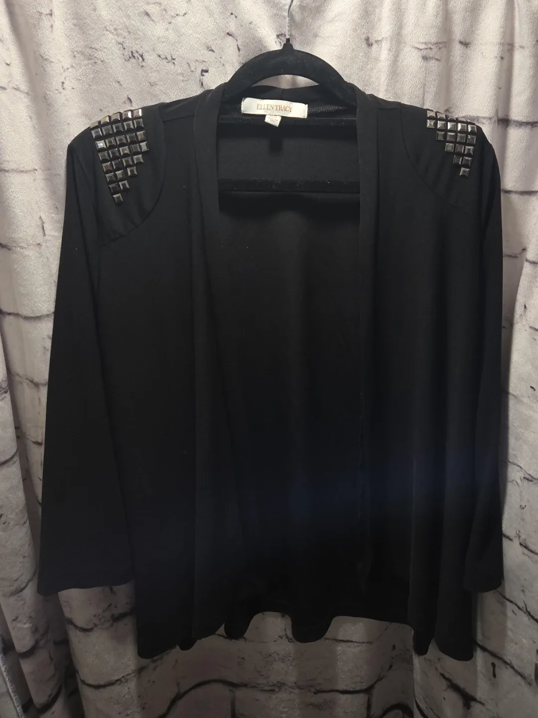 Ellen Tracy black open-front cardigan. Features silver-tone stud accents on the shoulders. Long sleeves and a flowy hemline.