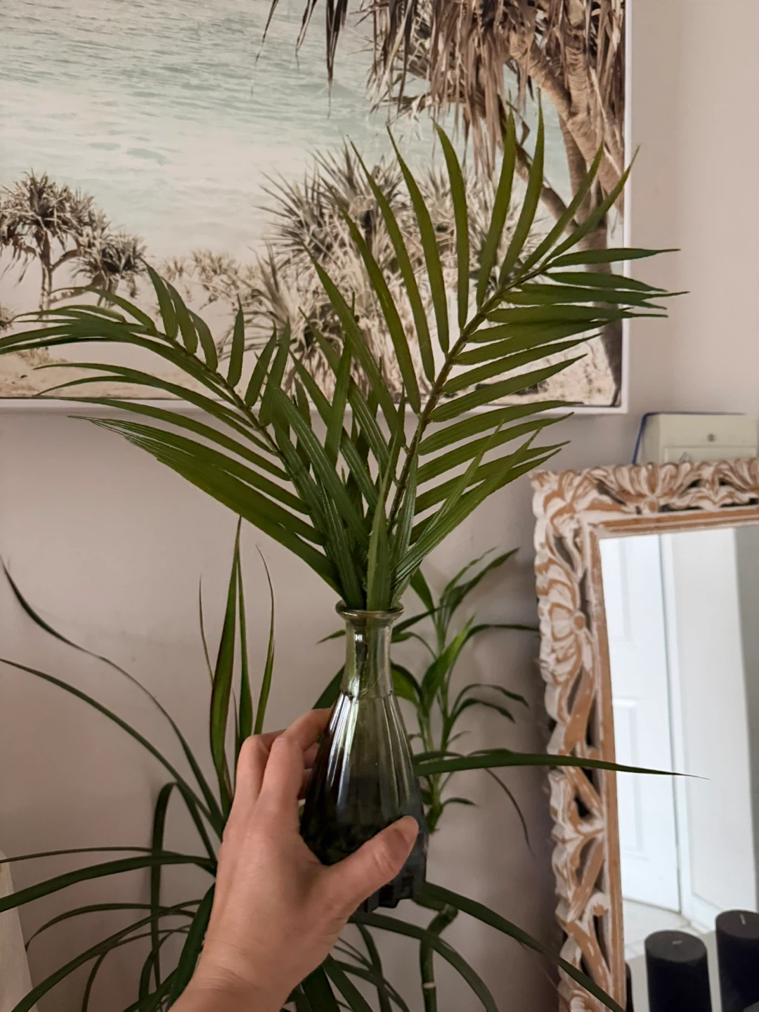A small green glass vase with a fluted design. It's perfect for single stems or small bouquets. This little vase adds a pop of colour to any shelf or table!