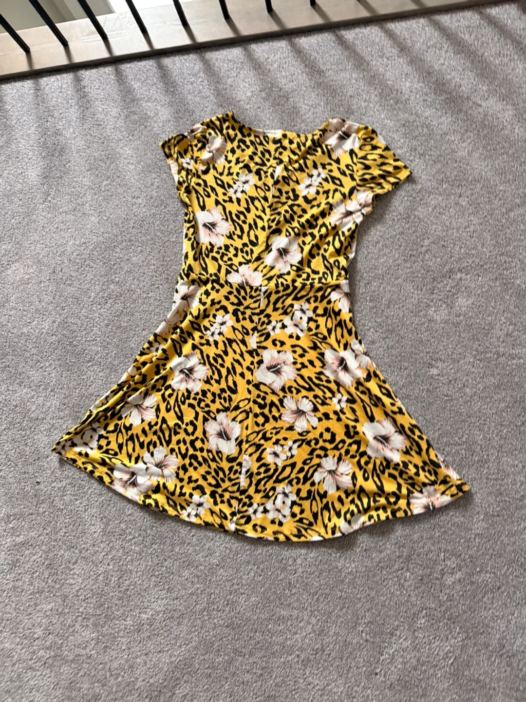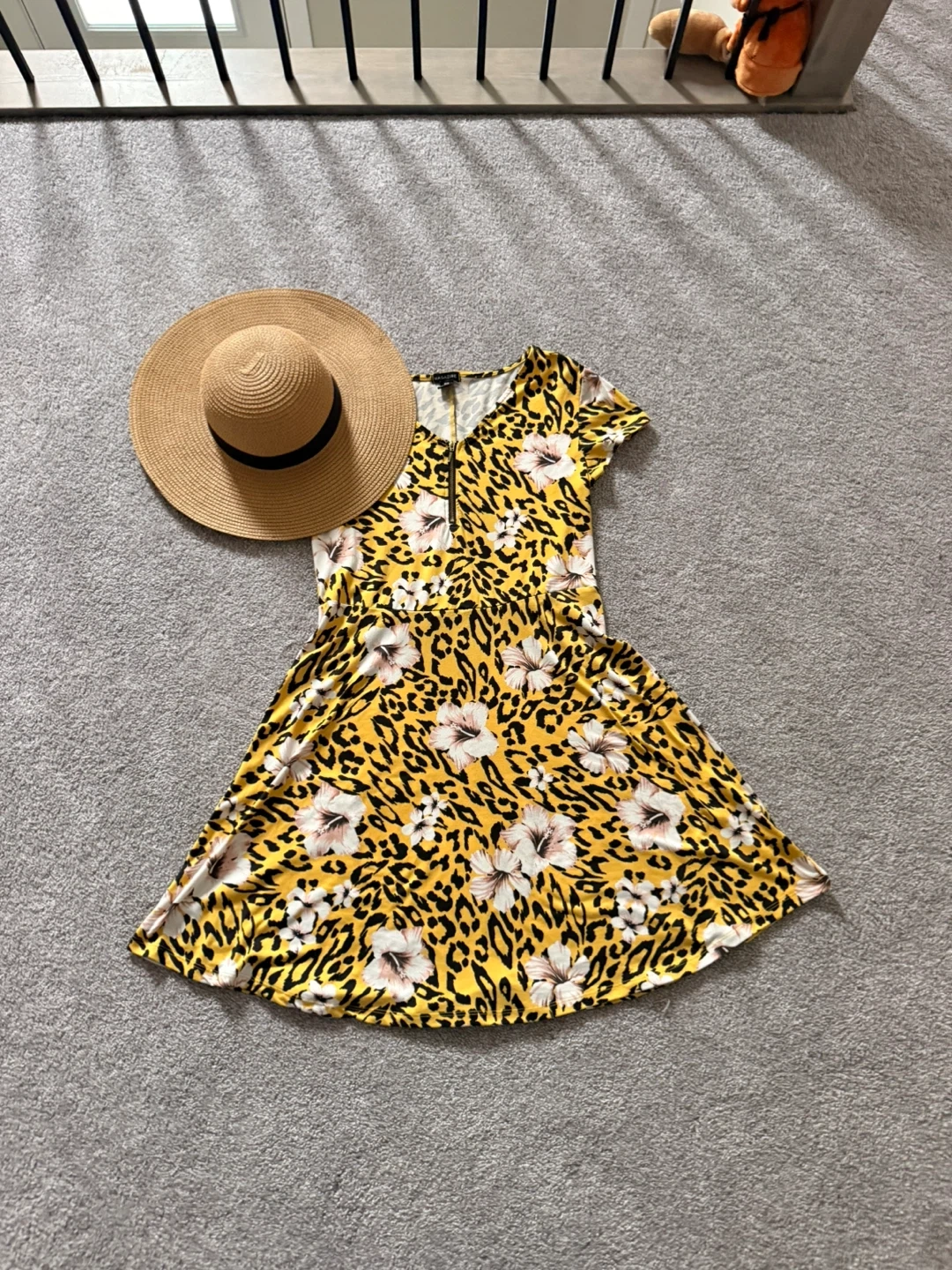Classic straw sun hat with a wide brim and a black ribbon accent. This hat's woven design offers a stylish way to shield yourself from the sun. It's perfect for beach days or gardening. With a beautiful yellow, cheetah print with flowers floaty dress. Perfect for any summer occasion with a zipper.