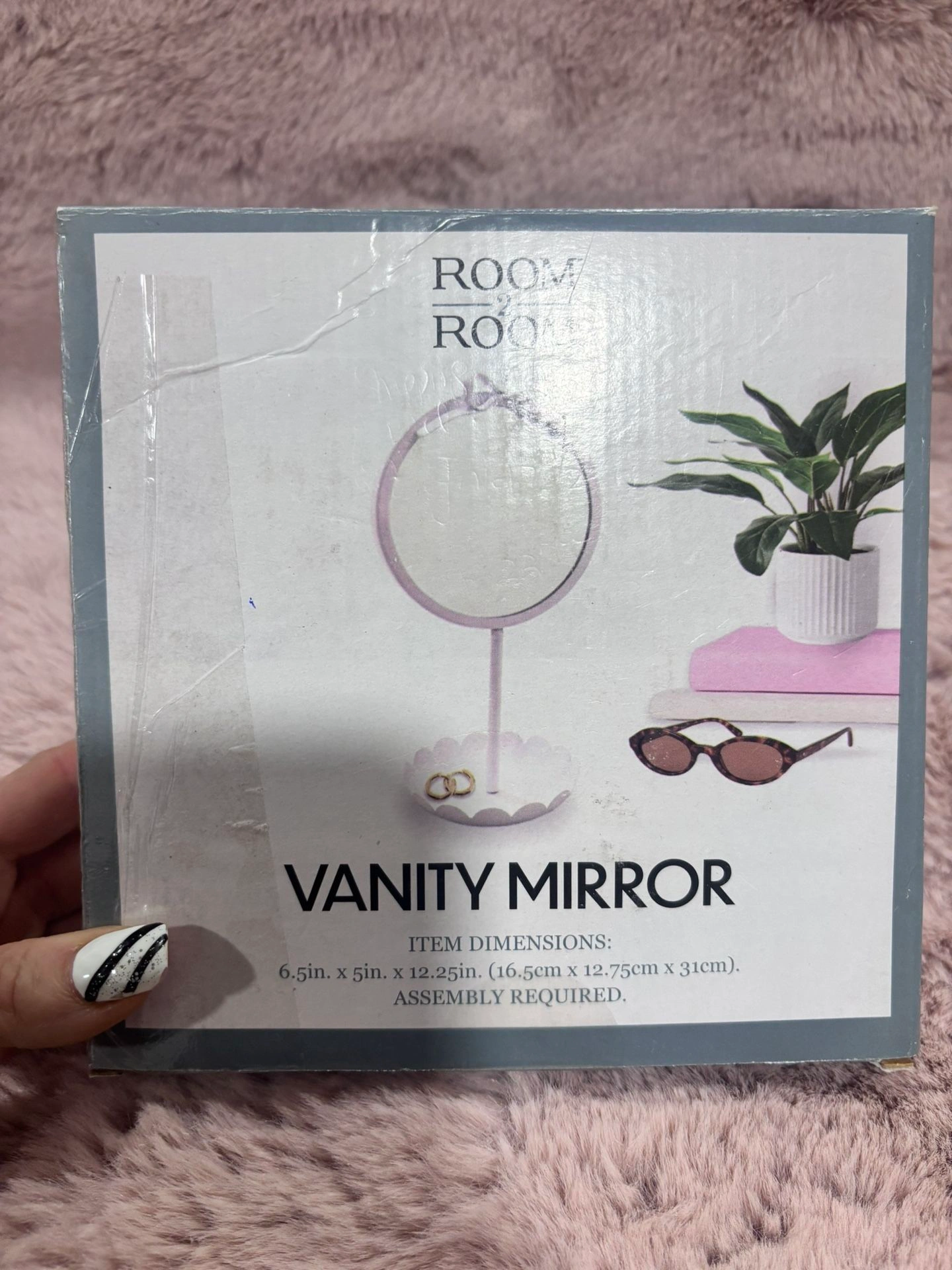 Charming Room to Room vanity mirror featuring a round tabletop design with a decorative bow detail and scalloped base. A lovely accent piece for a bedroom, dorm, vanity, or desk. New, unused. Still in original box. Box shows light shelf/storage wear. All parts included (assembly required). Approx. Dimensions: 6.5” W x 5” D x 12.25” H. Freestanding tabletop vanity mirror. Lightweight and easy to assemble. Neutral white finish complements many décor styles. Perfect for makeup, skincare, or decorative use.