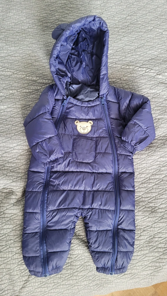Blue baby winter snowsuit with a bear on the front and a hood. Has a double zipper up the front for easy on and off. used few times. 12m