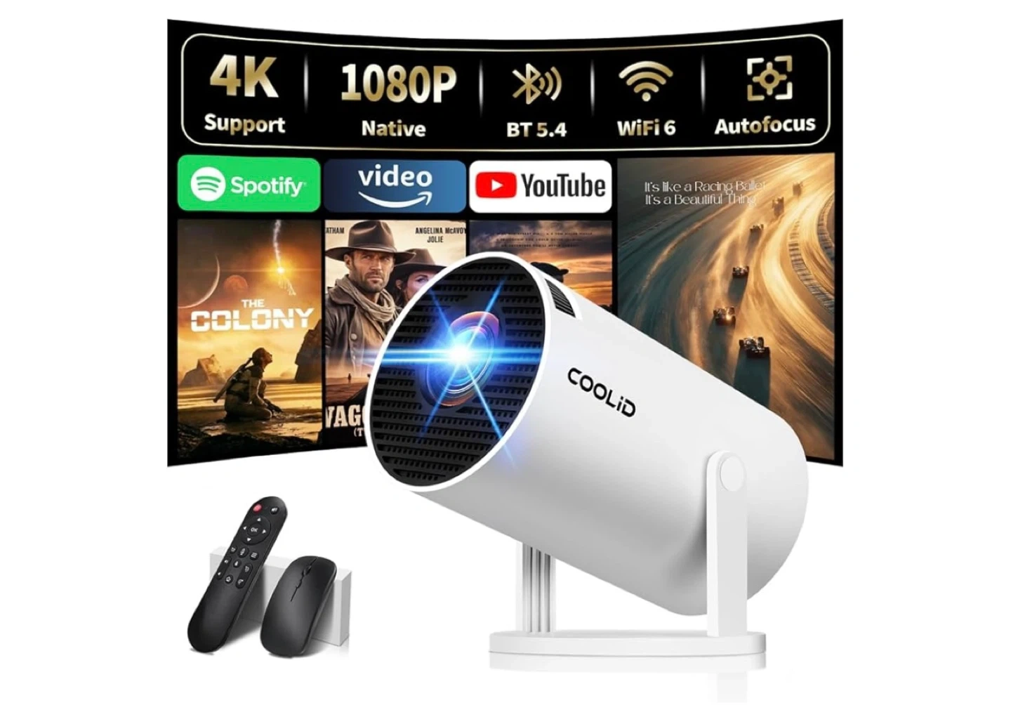 This COOLID portable projector supports 4K and has native 1080P resolution. It features BT 5.4, WiFi 6, and autofocus for easy setup. A remote and mouse are included.